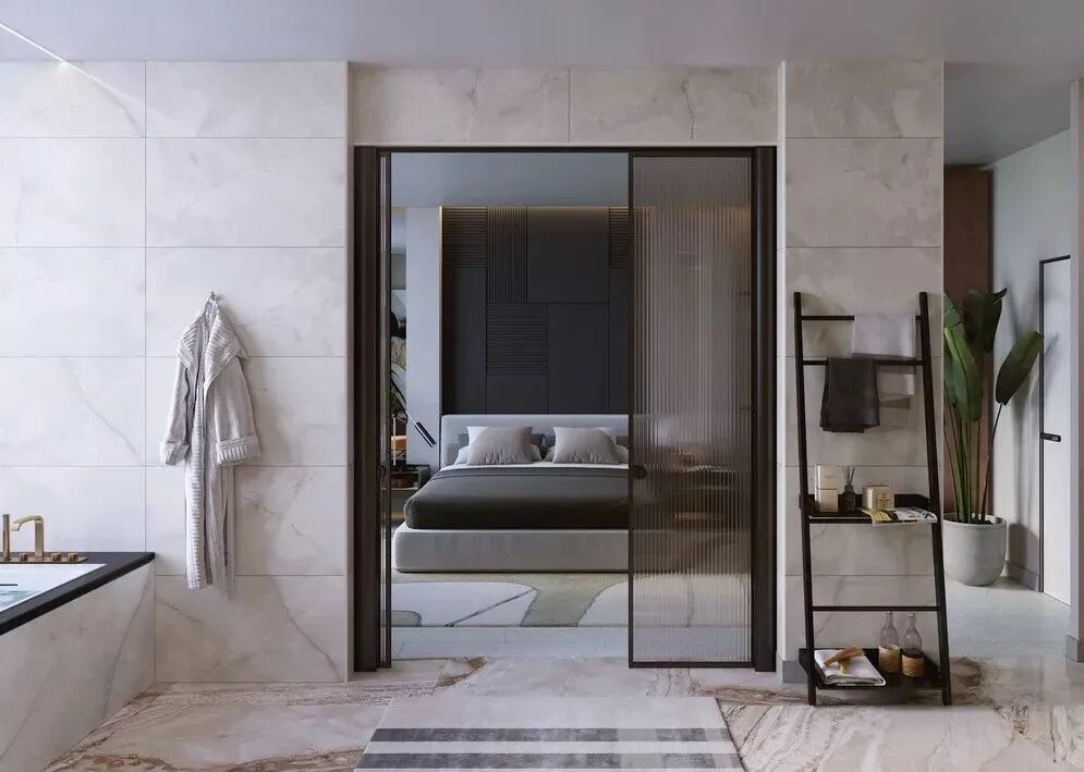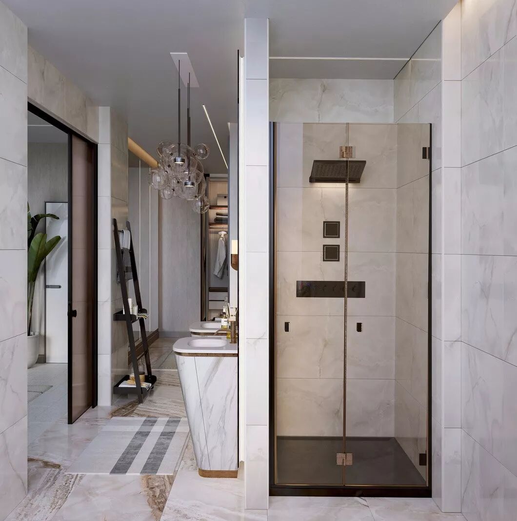 设计师善于从生活中汲取灵感,透明的球形吊灯,在粉色墙面的映衬下,突显法式的浪漫。黑框玻璃推拉门最大限度尊重了空间的整体性,只有开启的时候才展示自身轻盈和亮丽。