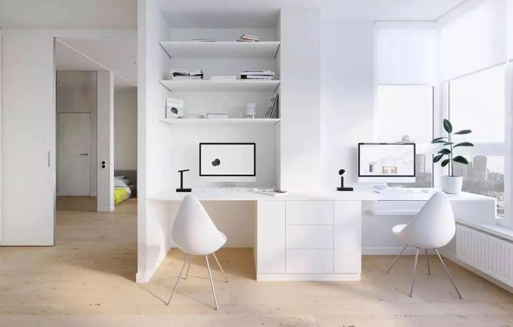 独立书桌:靠墙打上一组柜子或隔板,上方收纳、下方办公学习,高效利用空间。