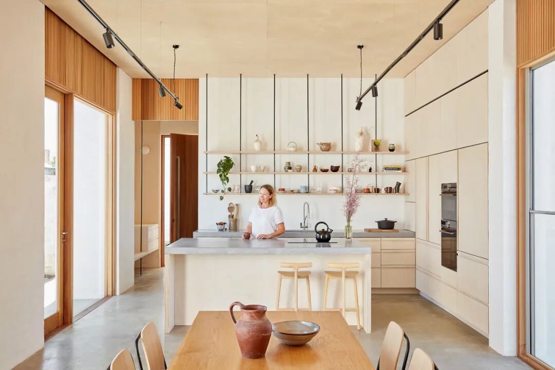 一层的一侧是厨房空间,配有浅色桦木胶合板制成的橱柜,同样的材料也被用来制作中央岛台的底座。