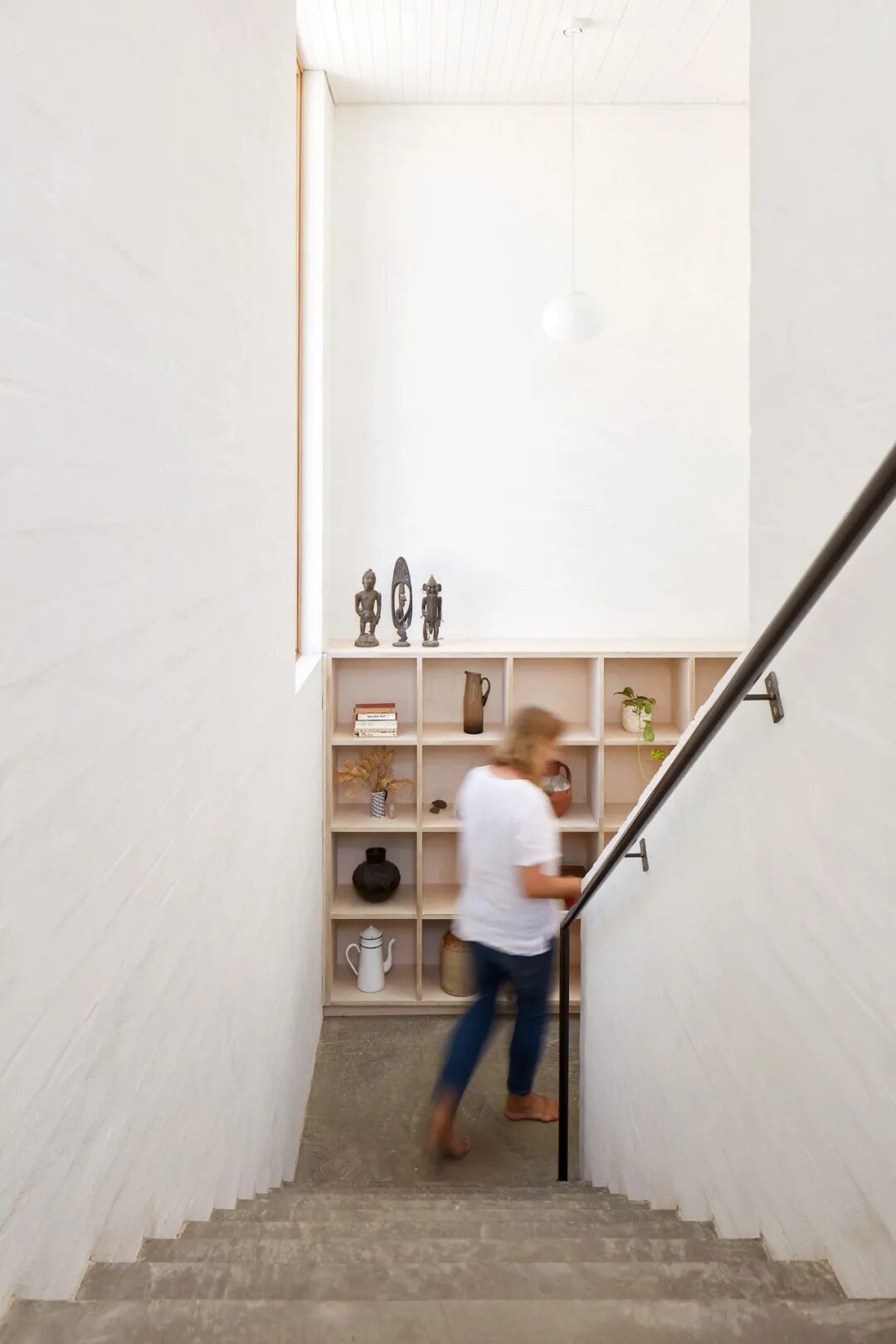 砖砌的楼梯间通向二层的主卧室,楼梯的尽头用胶合板打造了一个半高的陈列架,放置一些主人的心水收藏,纯白的空间整洁优雅又大气。