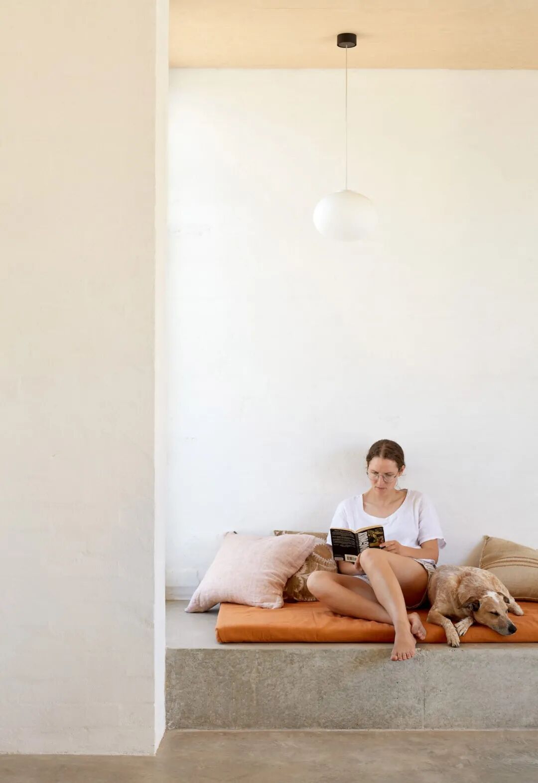 一个低矮的混凝土地台沿着房间的后部延伸开来,上面铺有舒适的座垫,摆放了柔软的靠垫,闲暇时主人可以在这里休息和阅读。