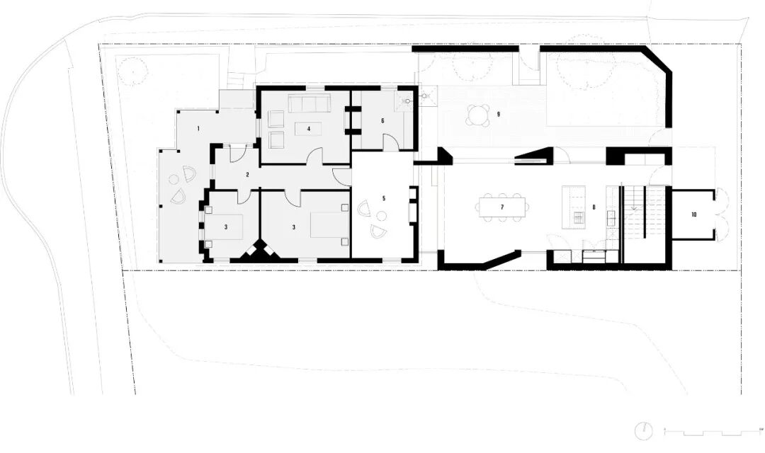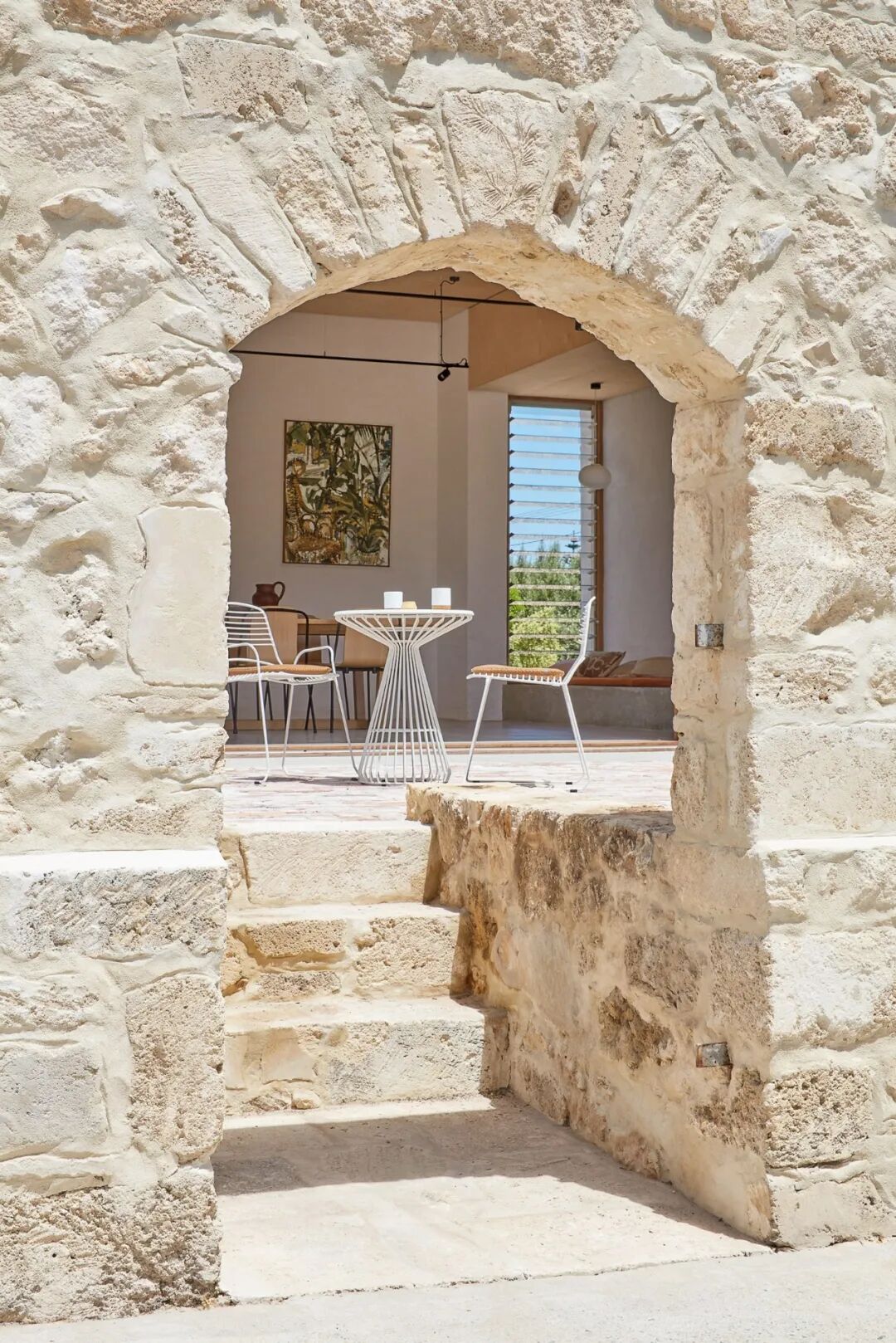 房屋前面的预先存在的石灰岩墙也被加高,形成一个私密的砖砌庭院,简单地摆上铁艺桌椅和几盆绿植,阳光明媚的天气在这里喝茶晒太阳看看书,别提多惬意了。