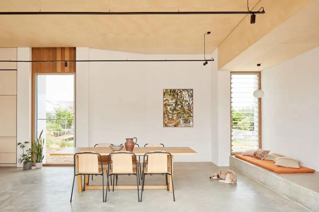一楼客厅整体选用了纯白的色调,混凝土地面和桦木胶合板元素贯串始终,温暖的雪松木窄板条用于装饰垭口。