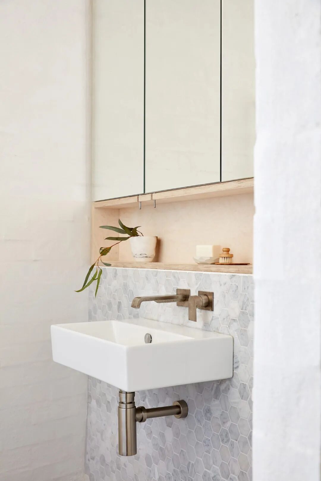 主卧还配有独立的浴室和步入式衣帽间,给了男女主人相对独立的生活空间。卫浴间同样采用纯白和卡其色为主色调,混凝土地面和卫浴间的大理石墙面让空间更有质感,金属五金和白瓷台盆复古又优雅。
