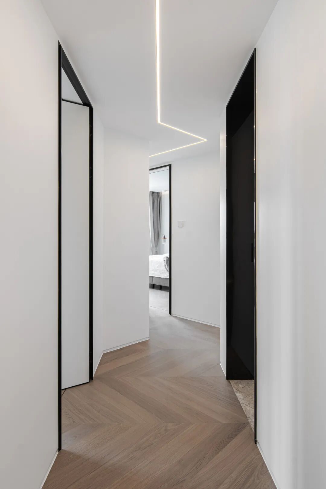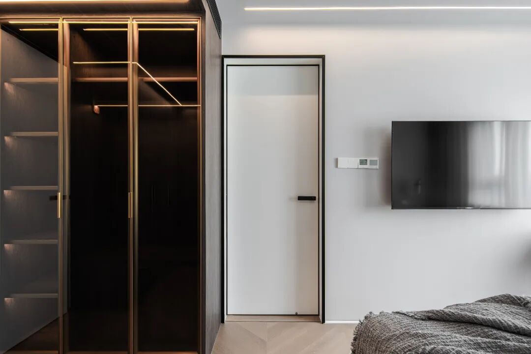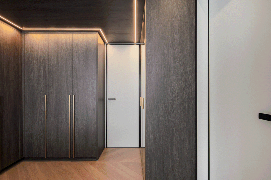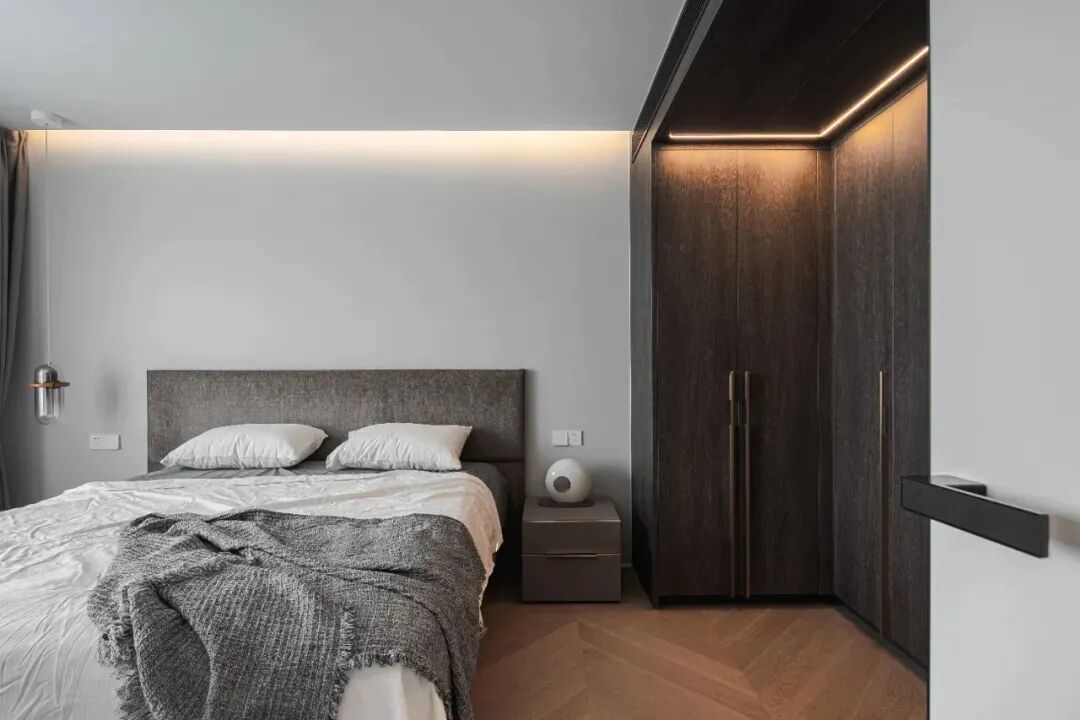 卧室门另一侧是宽敞的衣帽间,三组柜体占据墙体两侧,顶部灯带指引着空间走向。