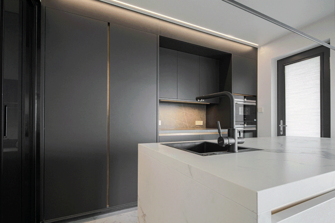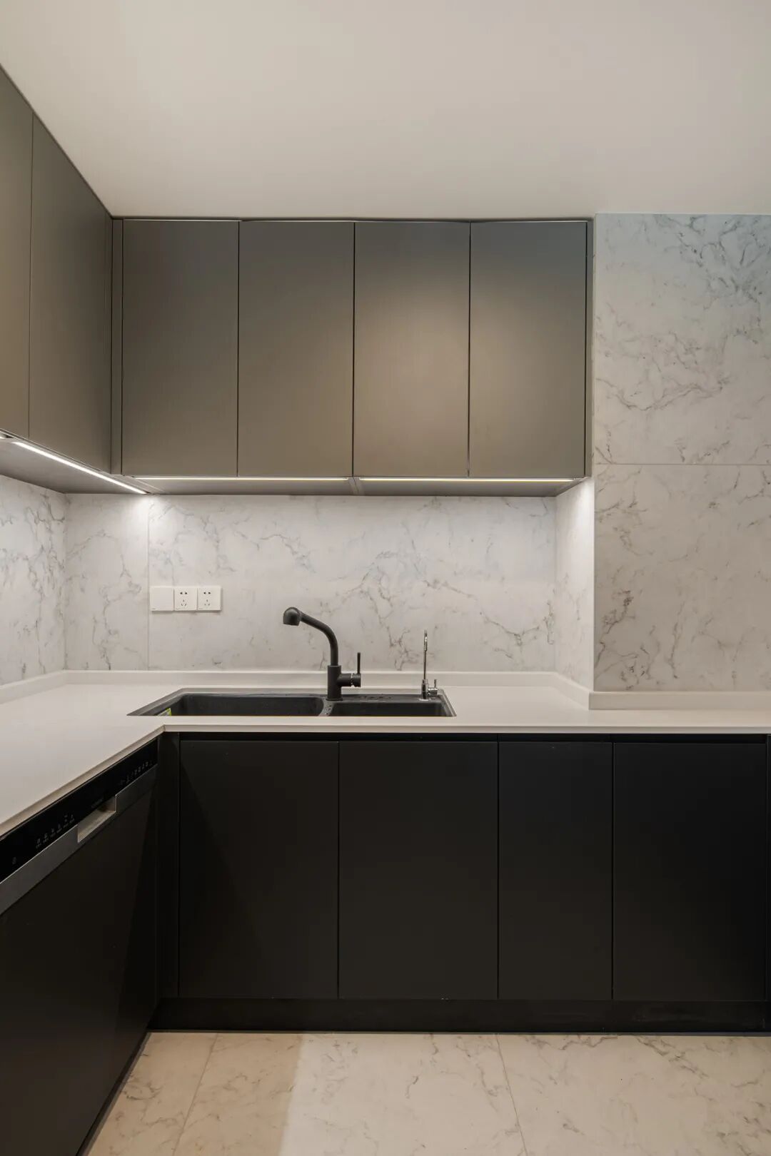 大件厨电和洗烘套组一应嵌入整墙黑色橱柜,高效利用空间且与整体极简风格相匹配。