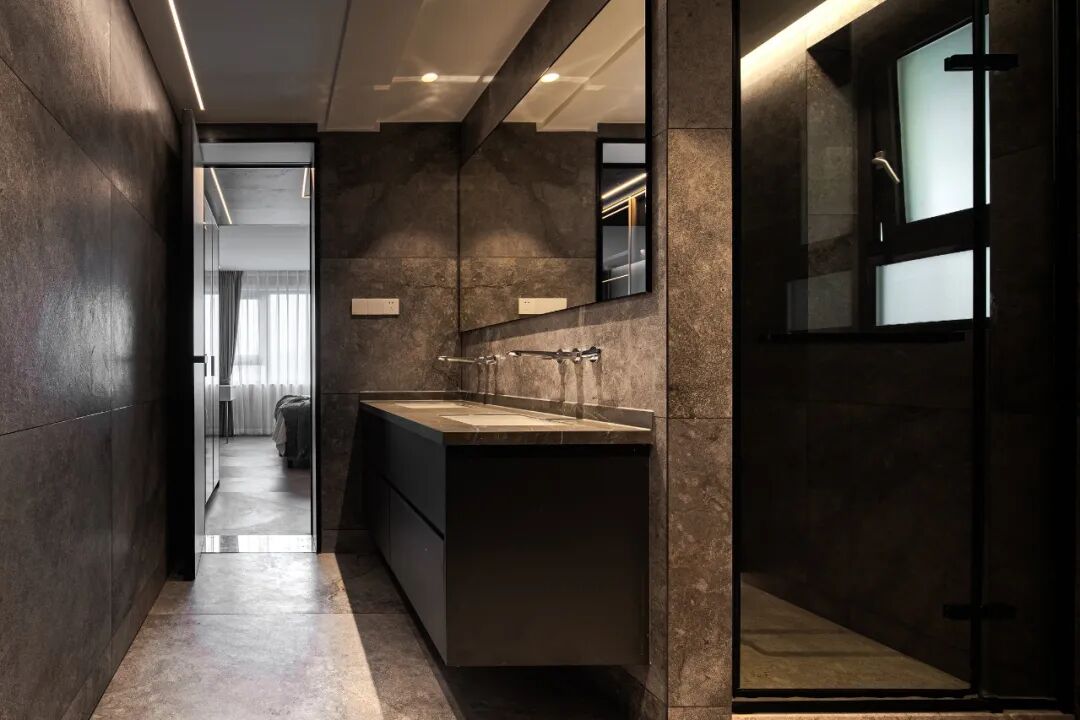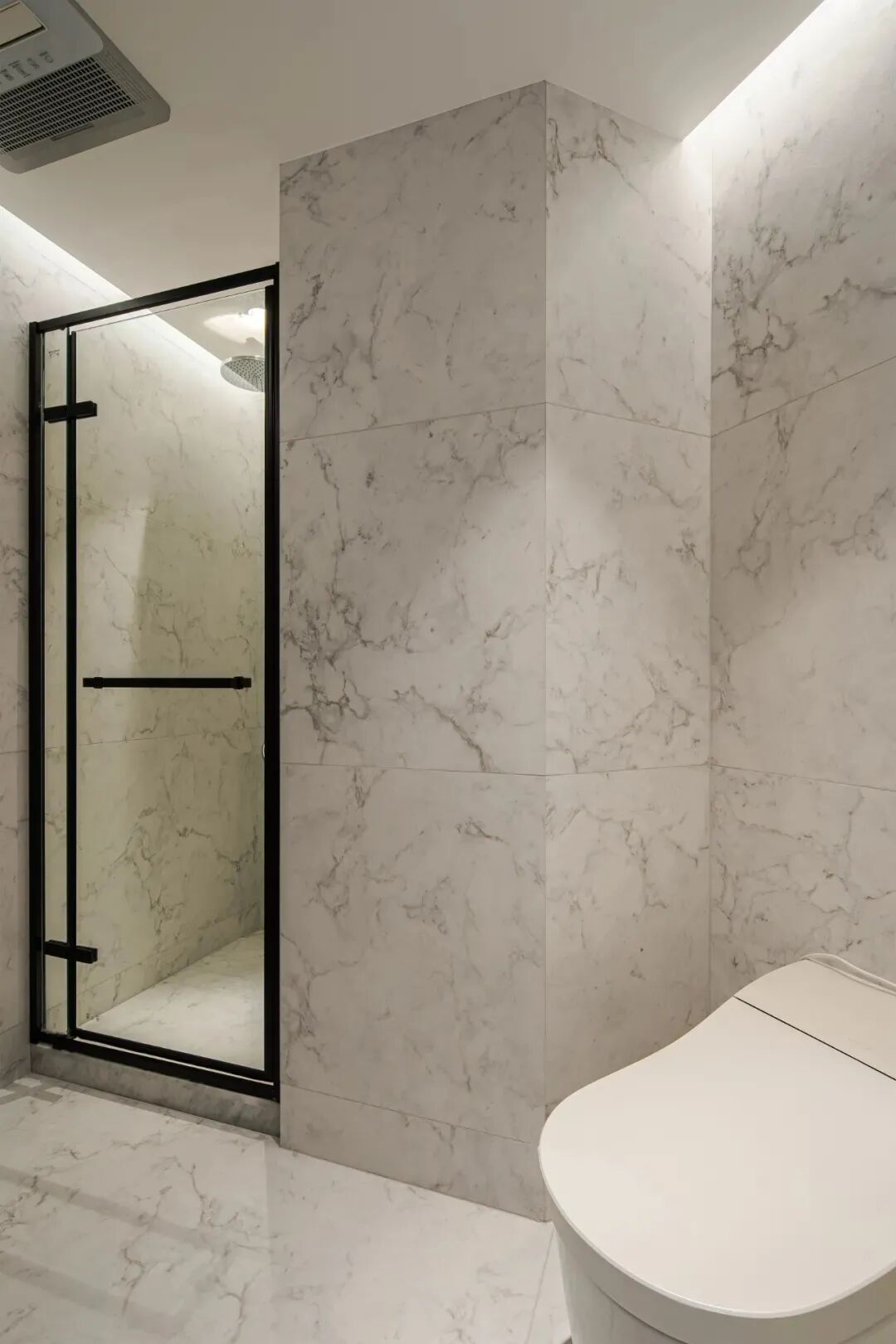 客卫墙地面沿用厨房同款意大利IMOLA陶瓷ONE系列石纹砖,冷静内敛的超白石英岩在灯光的映衬下,诠释出大自然不可复刻的神奇创造力。流畅灵动的纹理冷淡而疏离,只为独一无二的你。