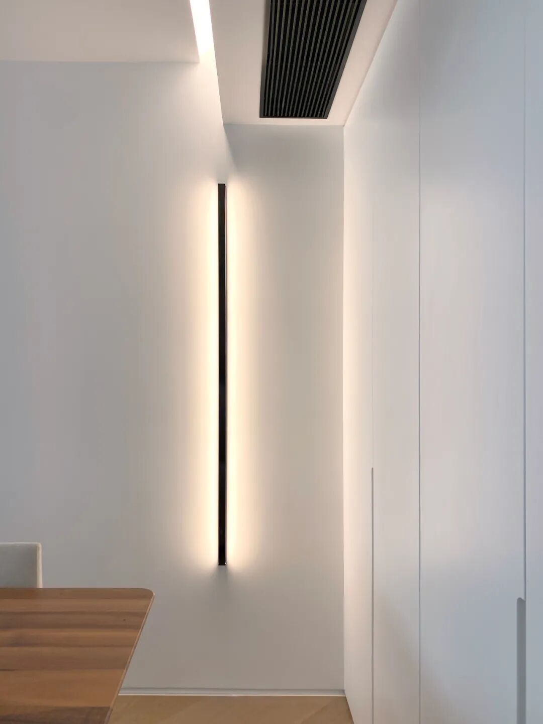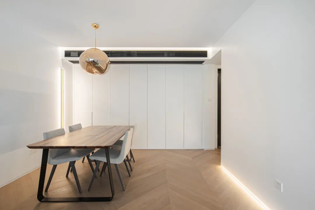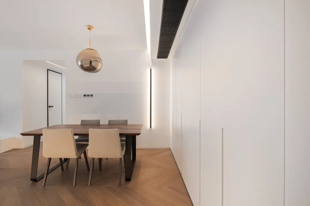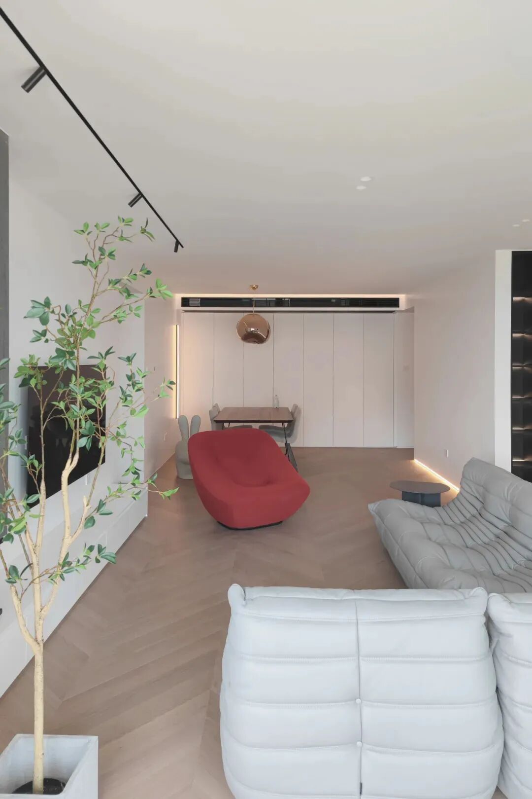 天花采用简洁的大平顶,磁吸轨道灯搭配隐藏灯带点亮重点区域,灯光均匀而有层次。