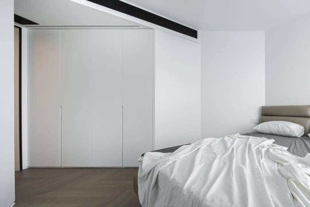 次卧与客厅共用一道斜墙,设计师化腐朽为神奇,沿墙面设计了一排储物柜,既合理利用了空间资源又恰到好处地遮挡着视线,让人无法一眼窥见内景。