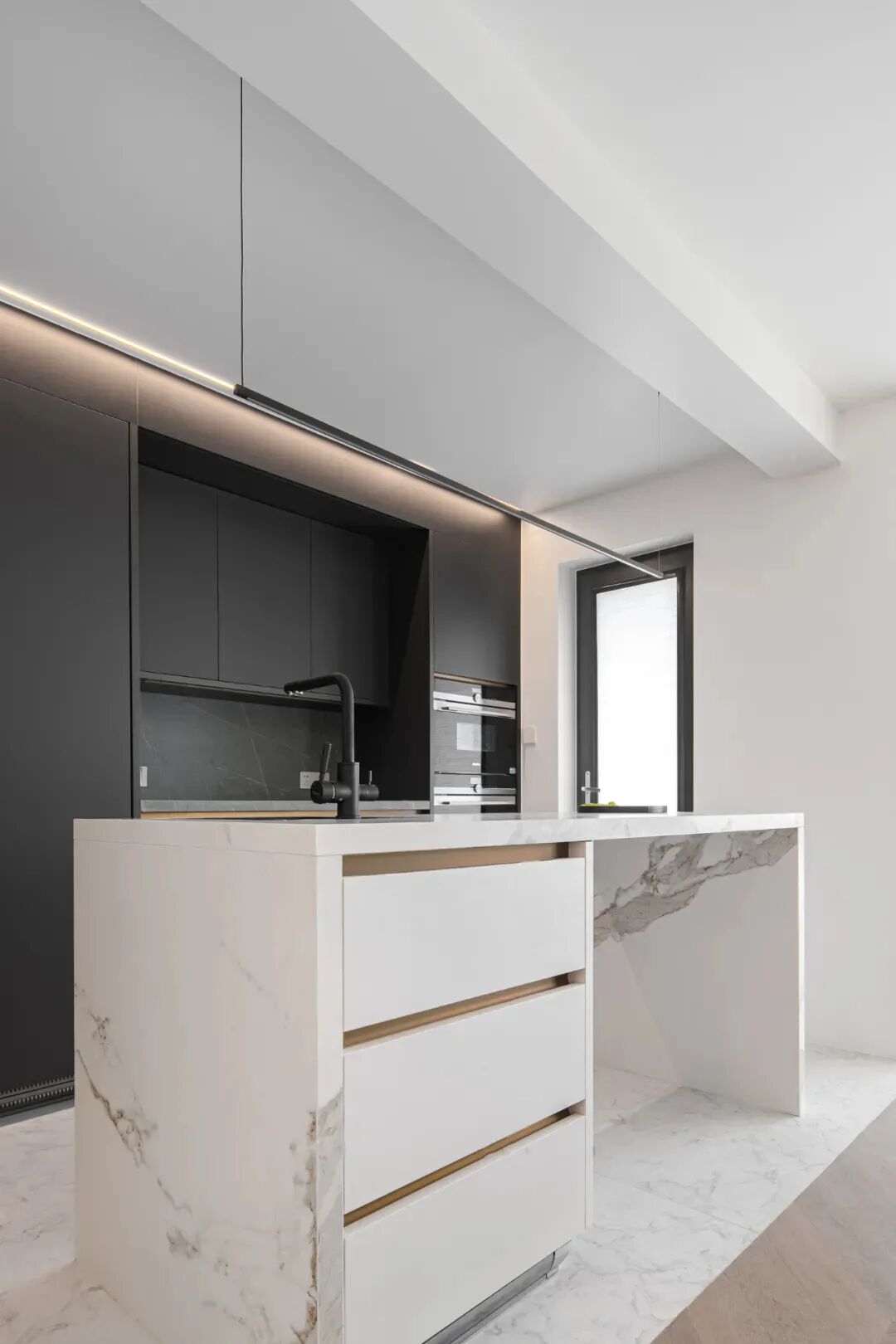 岛台上方悬挂的线性吊灯精致纤巧,丝毫不会喧宾夺主。
