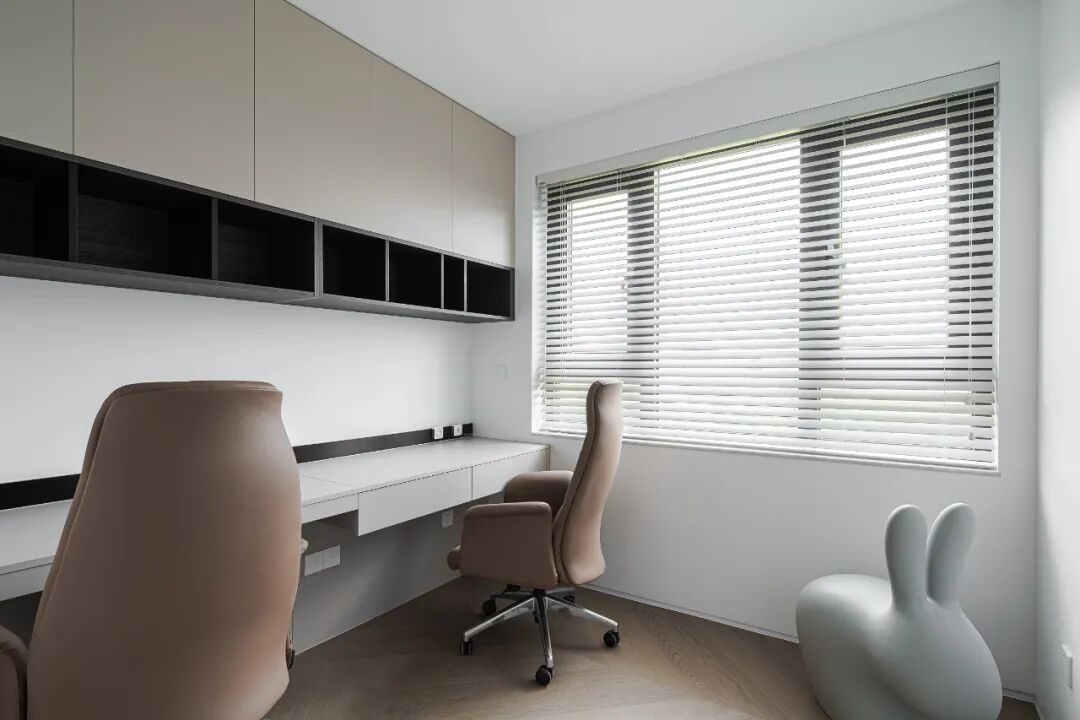 主、次卧之间的小屋,独立安静、采光通风良好,是办公学习的最佳地点。长条书桌靠墙摆放,阳光在百叶帘的折射下变得柔和又不失通透。