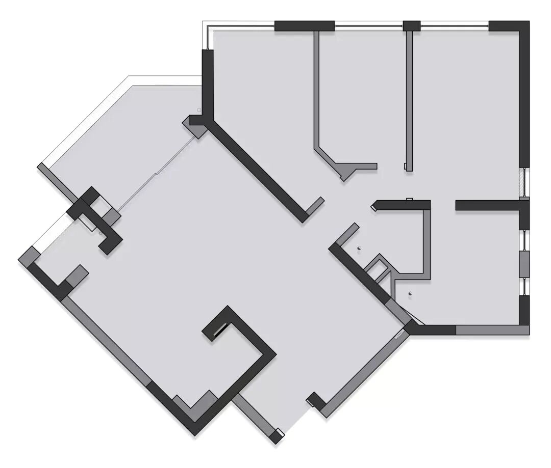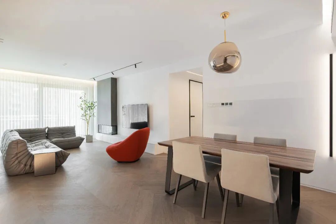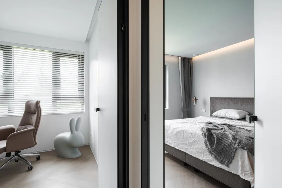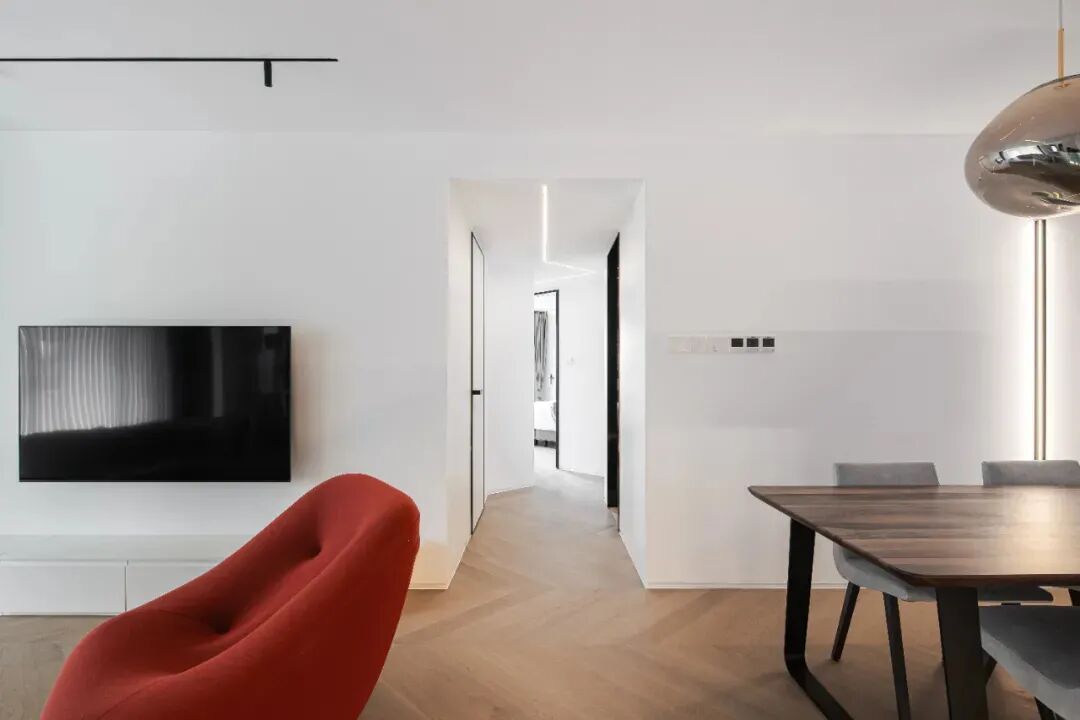 相比窗外绝佳的风景,不规则的格局和狭长的走廊则让人略有“遗憾”。设计师史鹏巍转变常规思维因势利导,利用走廊来实现动静分区,并采用大量冷色调来营造静谧的空间氛围,局部则搭配暖色软装来提升空间质感和温度,为业主营造出一方简约舒适的栖居之所。
