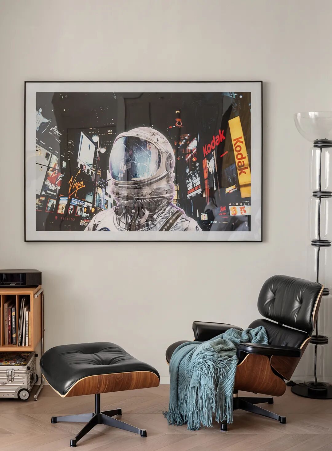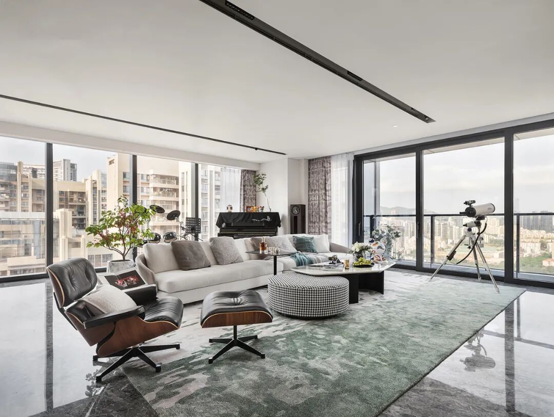 于霓虹闪烁的城市中,业主仍保有一颗像宇航员一样追逐自由太空的心,符合人体工程学的伊姆斯休闲躺椅,其材质由皮革和多层实木组合而成,舒适柔软,引导着主人卸下疲惫静养生息。