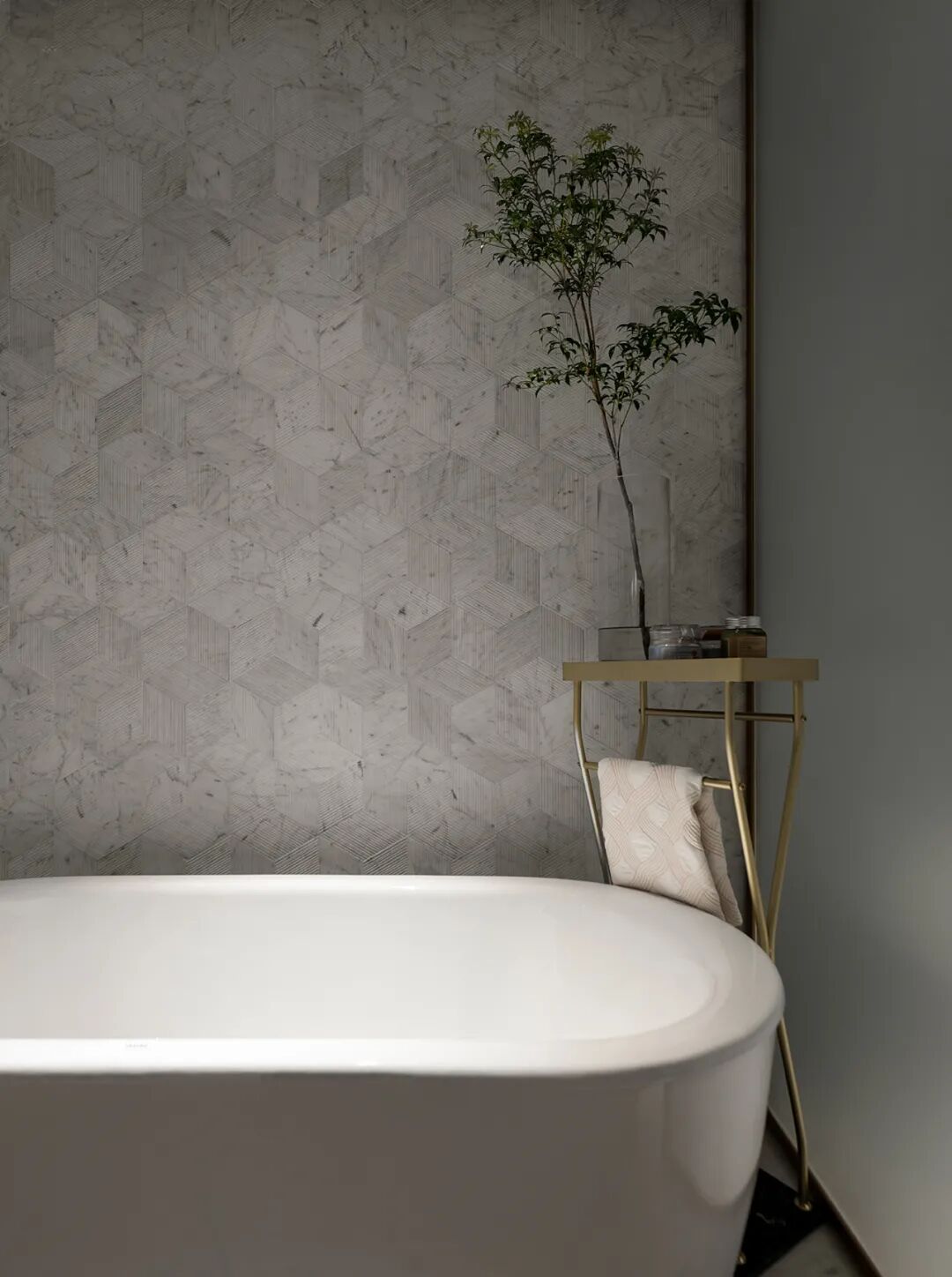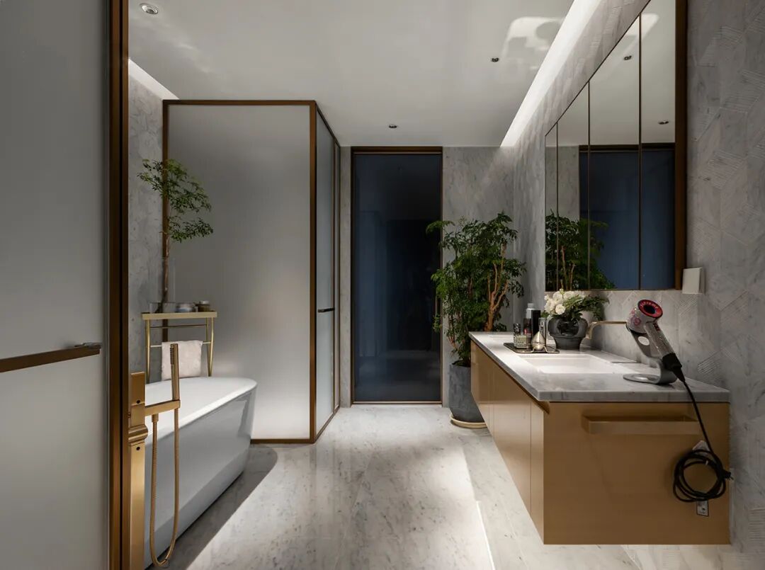 主卫空间以三分离的设计把控距离的分配,柜体设计了双台盆以应对同时使用的情况,再加上一个浴缸区满足不同淋浴的需求,打造随心所欲的多功能卫浴空间。