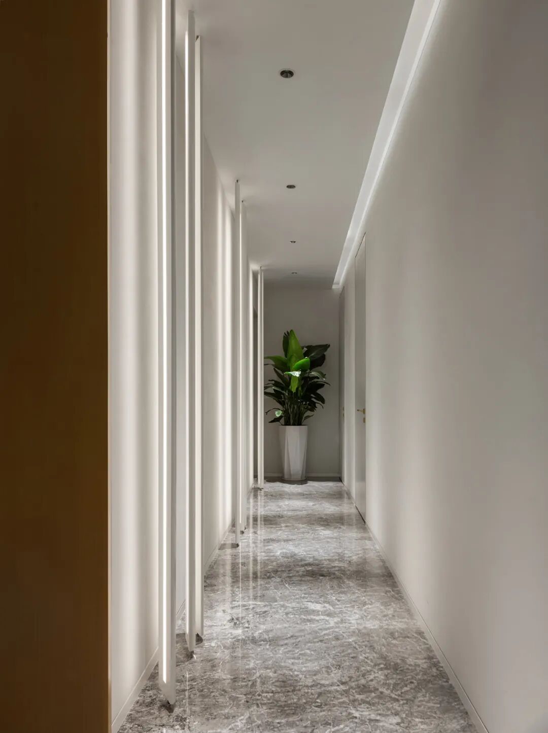 在廊道的指引下迈入西侧次卧区域,连续规则的灯带光影曼妙,具有非常强的视觉穿透和引导作用,解决了狭长通道带来的压抑感。