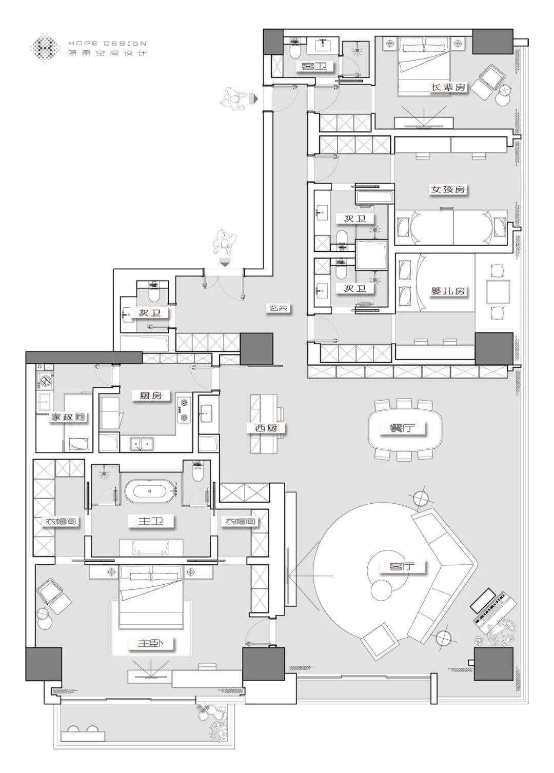有一种幸福叫“三代同堂”,本案正是一套三代人同住的舒适四居,格局虽够宽敞,但想要兼顾几代人的需求,同时实用与品质并存,也是不小的挑战。