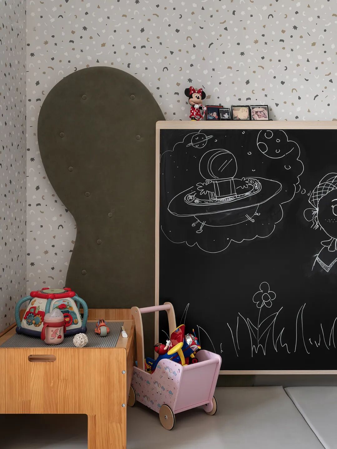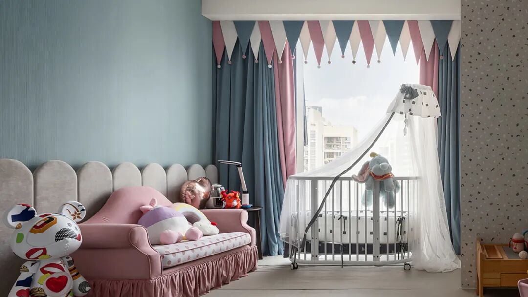 设计师从幼儿的安全和发育出发,婴儿房选择了以粉、蓝+灰色为主,既活跃了空间又不会太过跳跃刺眼。同时用儿童爬行垫代替地板,不怕磕碰也更好打理。莫兰迪色系在空间中相互碰撞,梦幻而充满童趣。