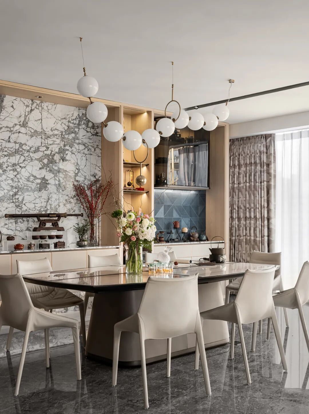 用餐区域依然是开放式格局,整体配色温暖柔和,一组木质展示+收纳柜包罗万象,奠定了温暖的基调。白色吊灯如珍珠项链般垂于餐桌上方,日光透过柔纱照进来,混着鲜花的香气,明亮而有生机。
