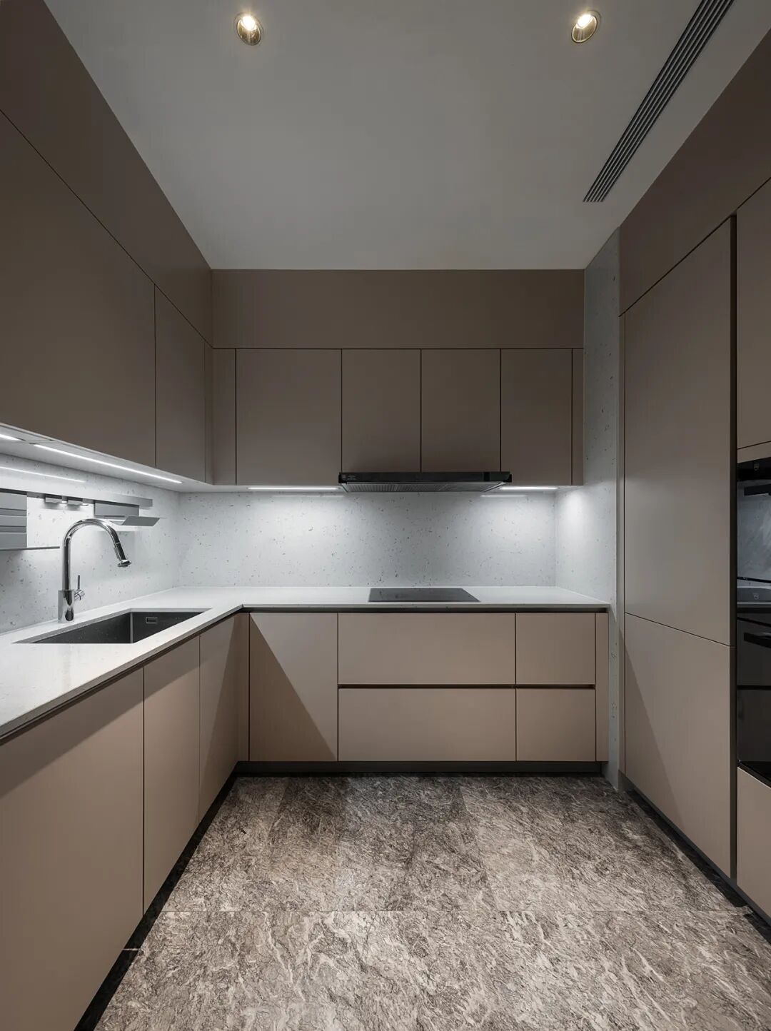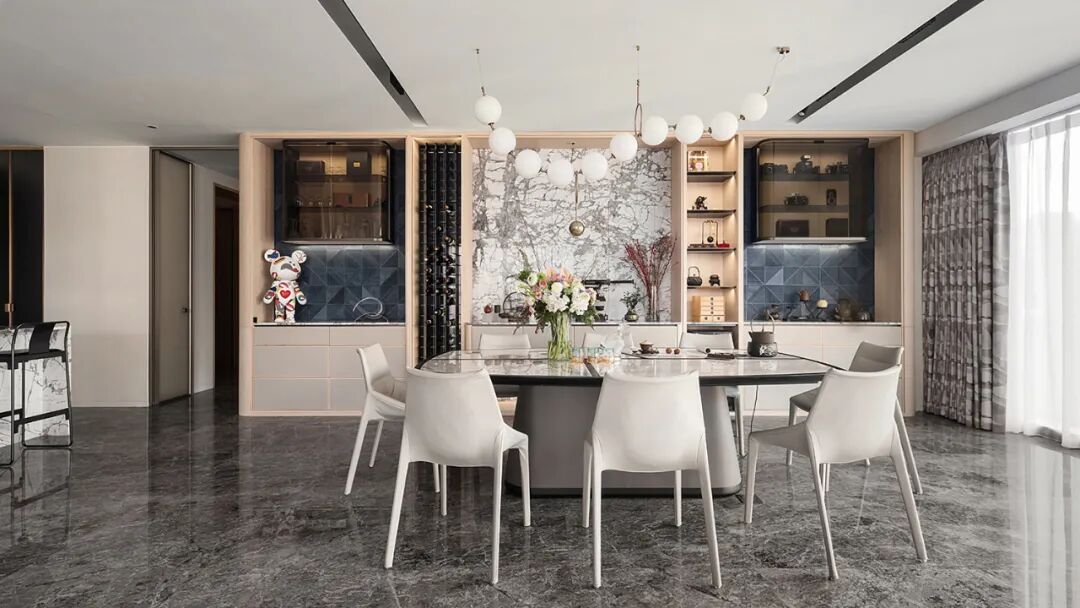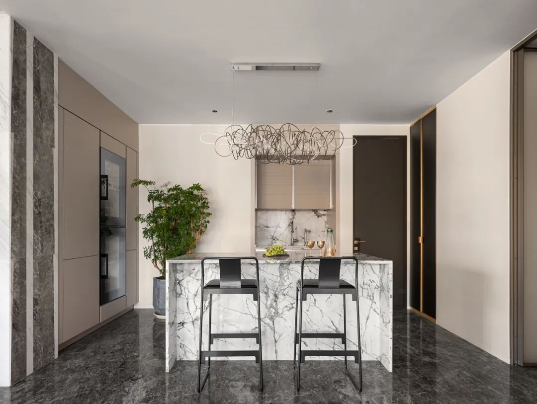西厨以天然大理石中岛规划"回"形动线,其自然多变的纹理赋予空间强烈的张力。嵌入式设计将冰箱融于墙面,扩大收纳空间的同时实现流畅的布局。