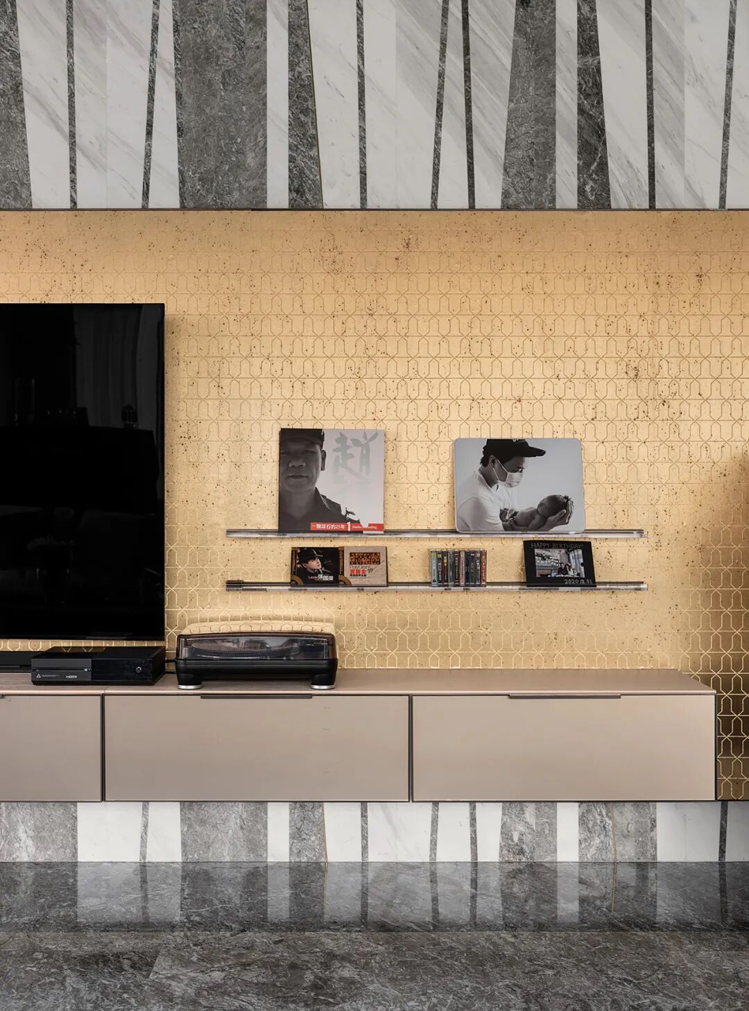 设计师利用材质与色调的对比赋予空间层次感和立体感,电视背景墙上石材与金属等不同材质的交织丰富着空间的元素,而其本身特有的延展性特点使得客厅更加宽敞且充满冲击力,内敛中蕴含着贵气。