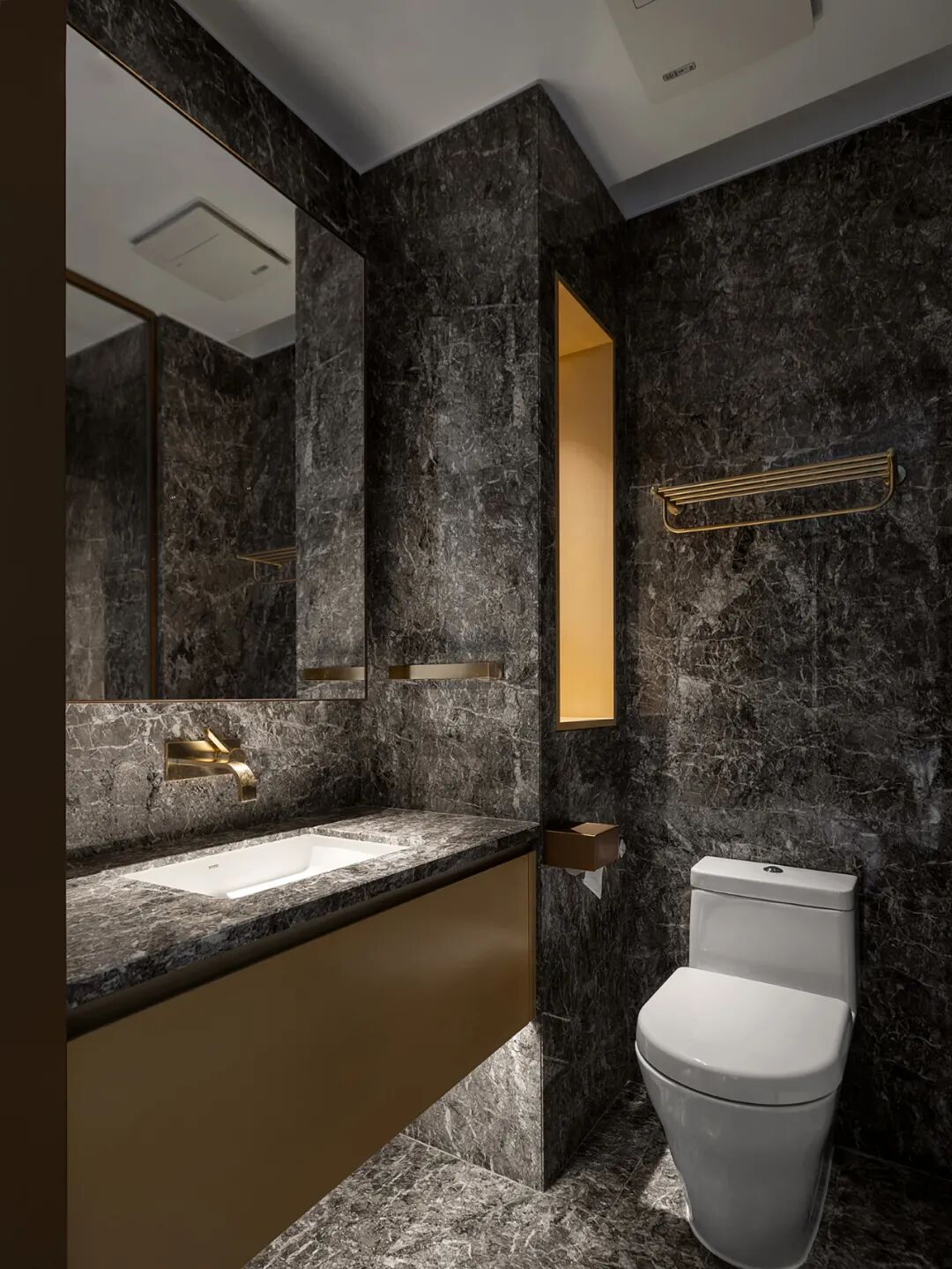 玄关客卫则是独树一帜的暗色系,隐藏灯带的设计点亮着不起眼的角落更加方便使用,反光材质将空间向镜面延伸,简约大气之感由内而外散发。
