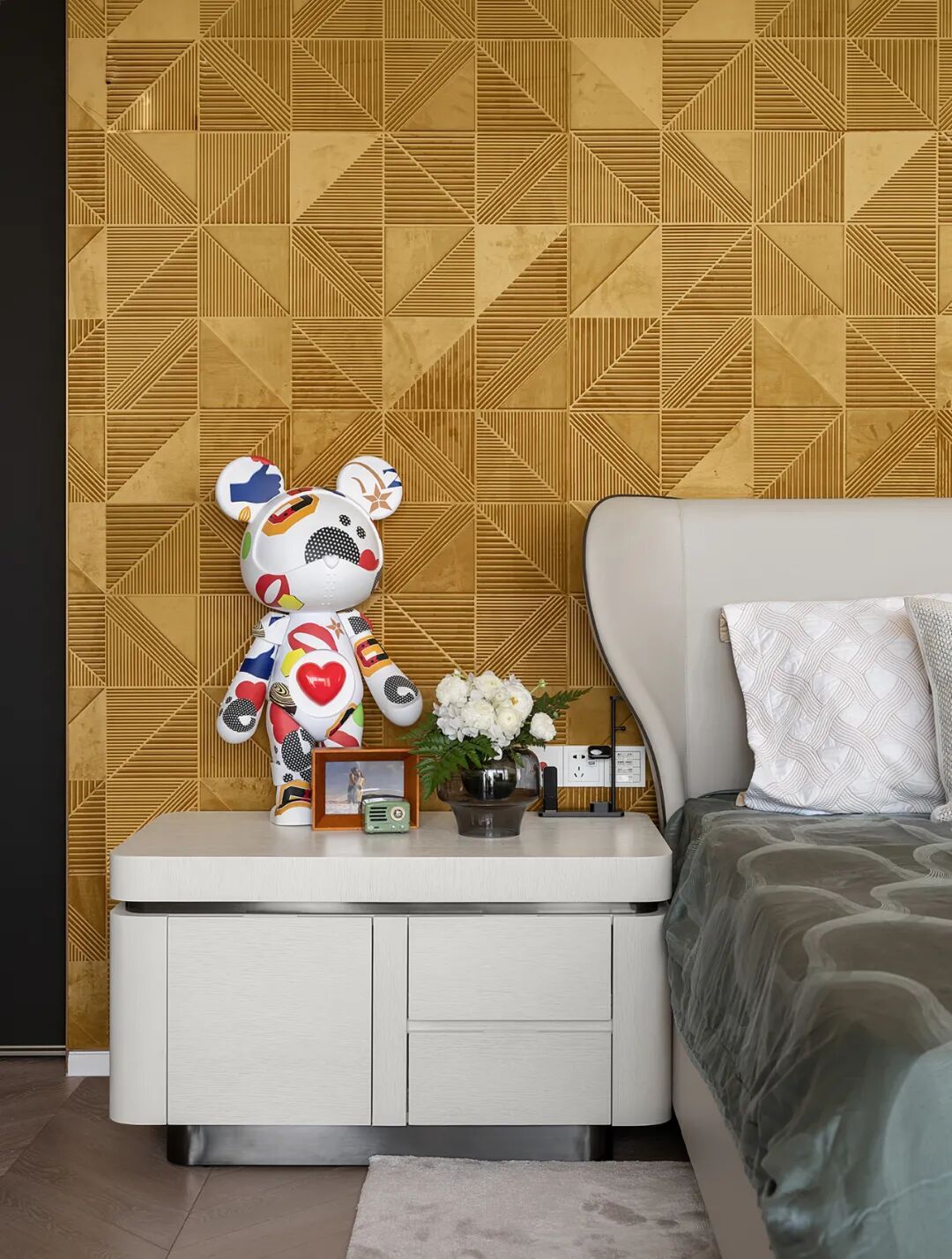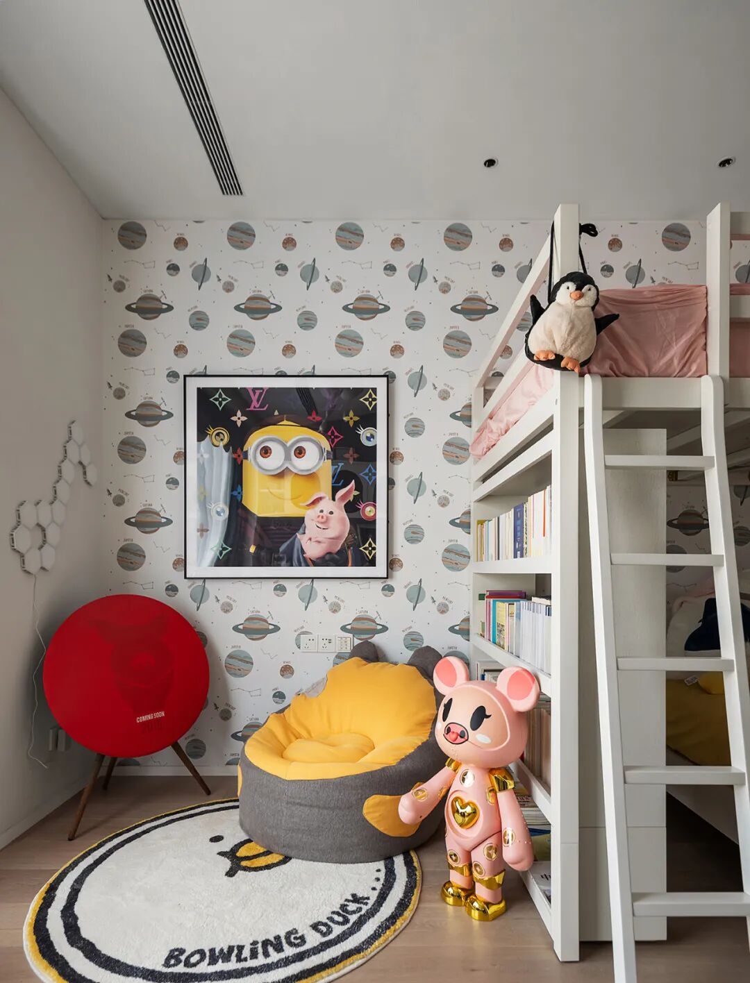 回归私密空间,沉稳细节的硬性元素占主要比重,温暖的原木、布艺则中和了冰冷的气息,再加以潮玩积木熊的衬托,整体充满治愈力。