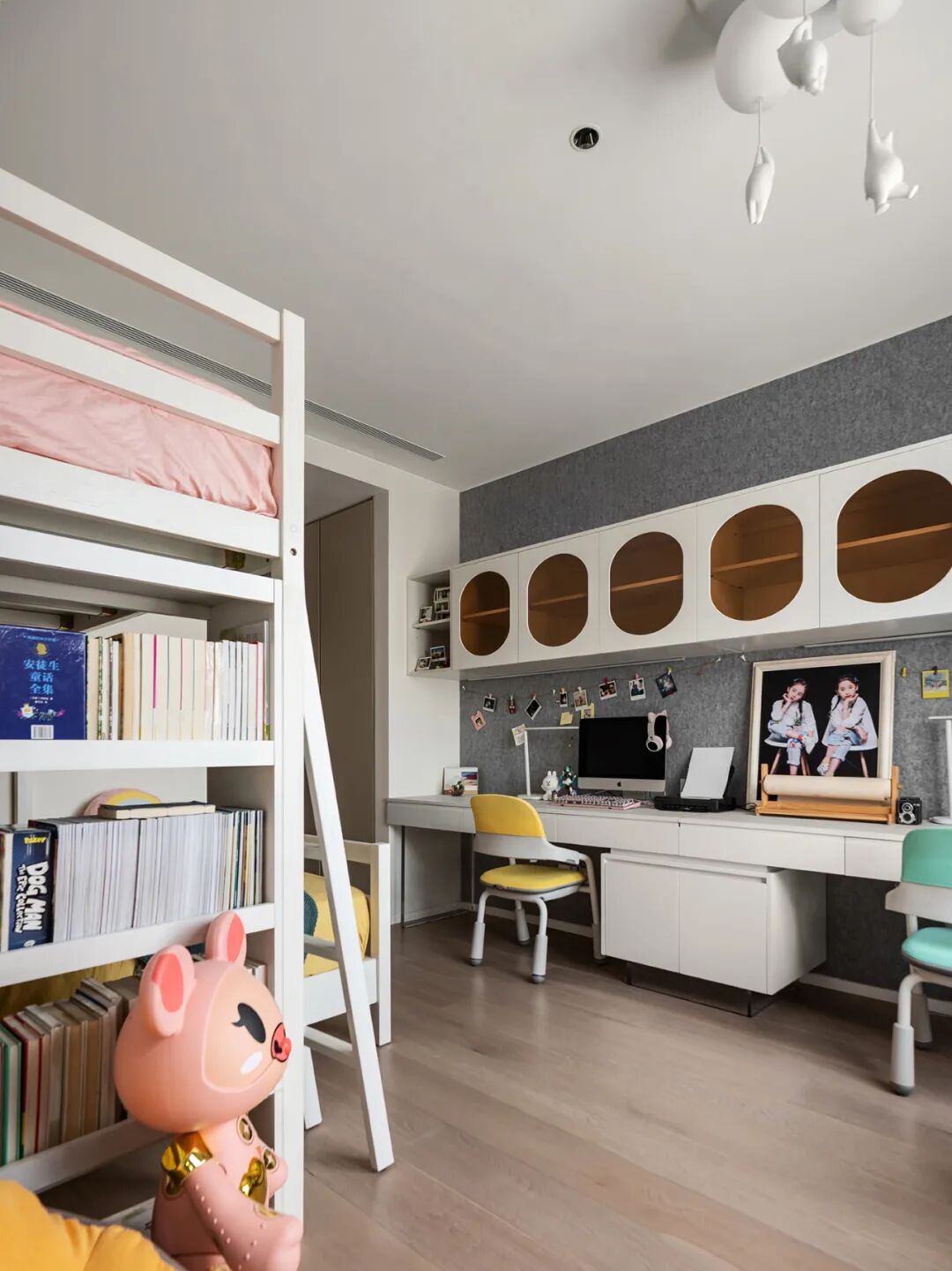 次卧全部采用套间设计,私密性更强。双胞胎女儿共享一个房间,双层床的设计不仅节省空间,还能增加互动性。同时打造高度适宜的书柜进行收纳,并通过色彩缤纷的摆饰创造出兼具实用与乐趣的成长房间。