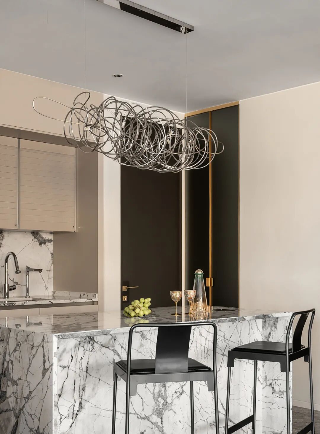 隐藏式插座与中岛色调和谐搭配,定制不规则排列灯具让艺术氛围扩散的同时,更映射出自由不羁的生活态度。