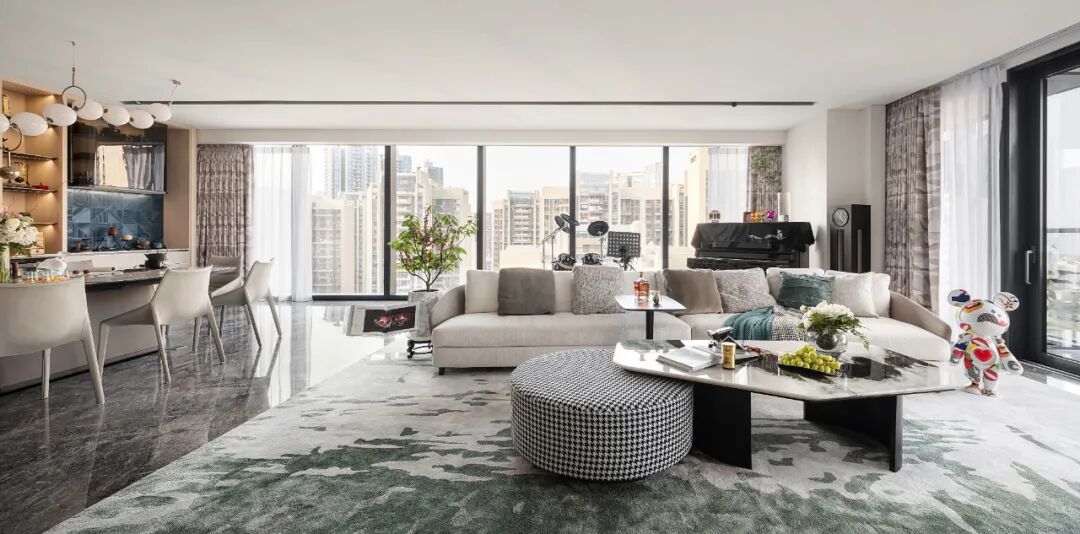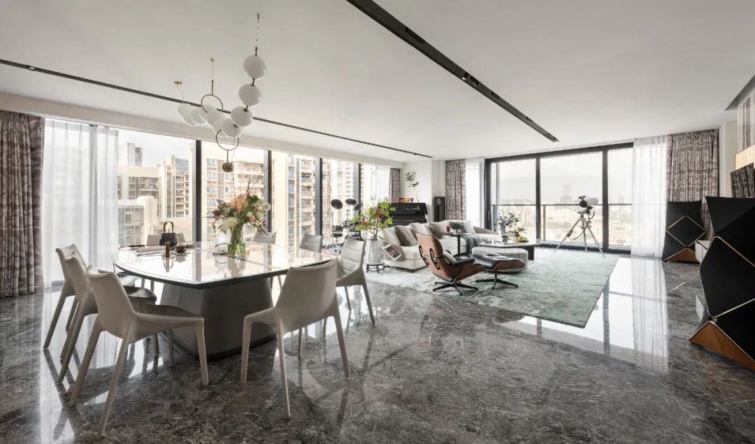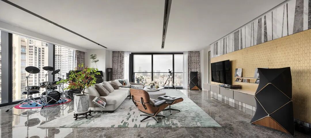 客厅面积近95㎡,设计师用乐器串联起宽敞的空间,以音乐为纽带促进家人更加亲密的相处,让情感在空间中延续。