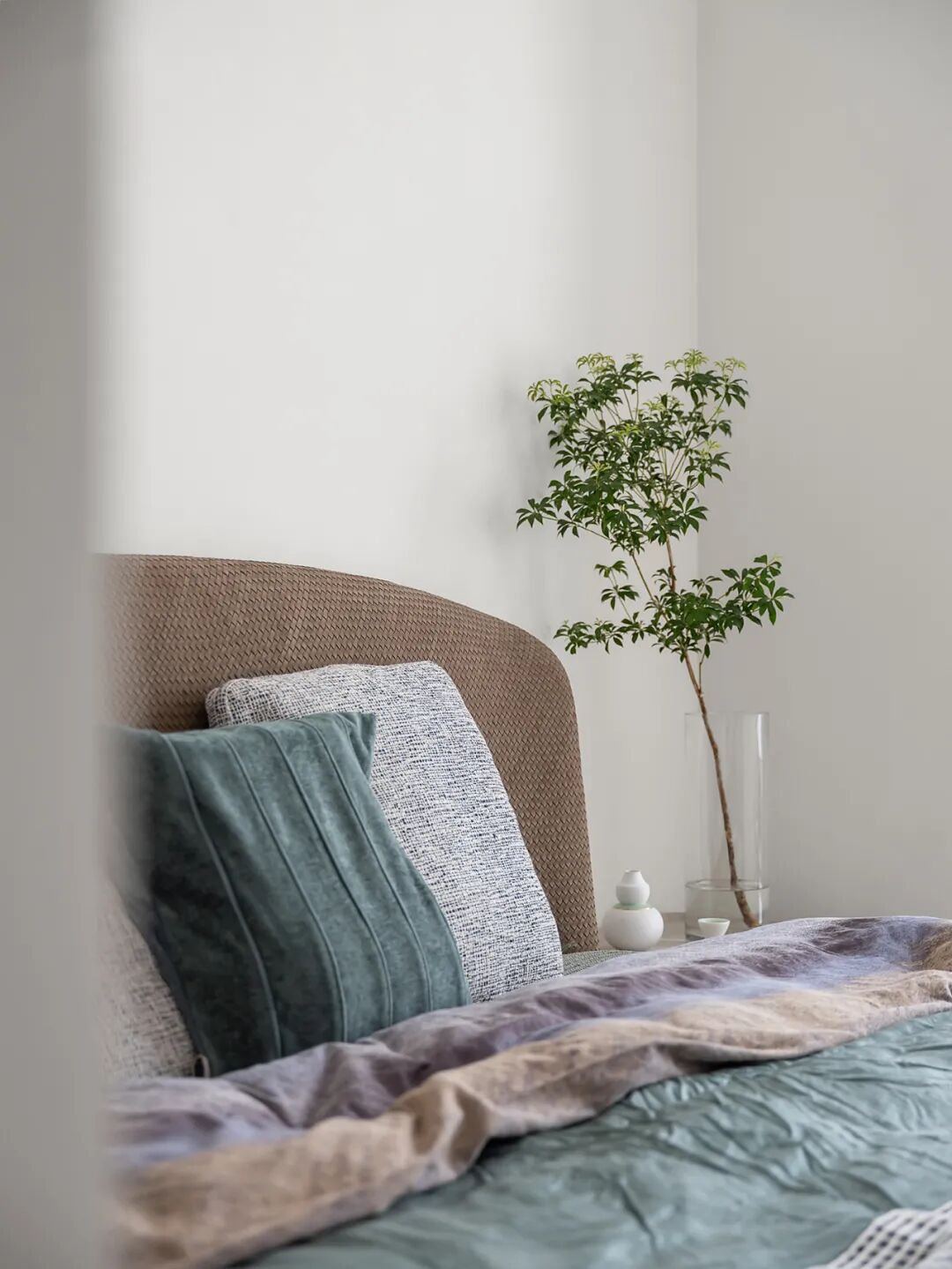 长辈房更多采用棉麻材质,舒适自在更突出了心境的稳定,结合"福禄"的寓意以葫芦形态点缀,表现一种平静祥和的养生之道。