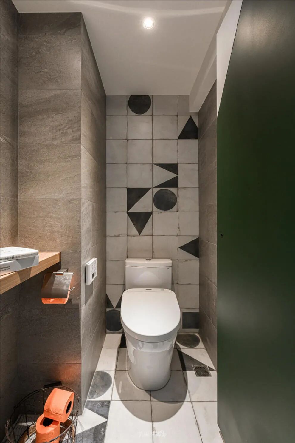 2.因厕所入口位置无法更动,直接面临主要大门动线,透过隐藏式门片和几何造型主题牆,成功隐匿存在感,并且形塑简洁、利落的居家风格;