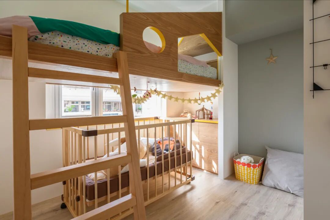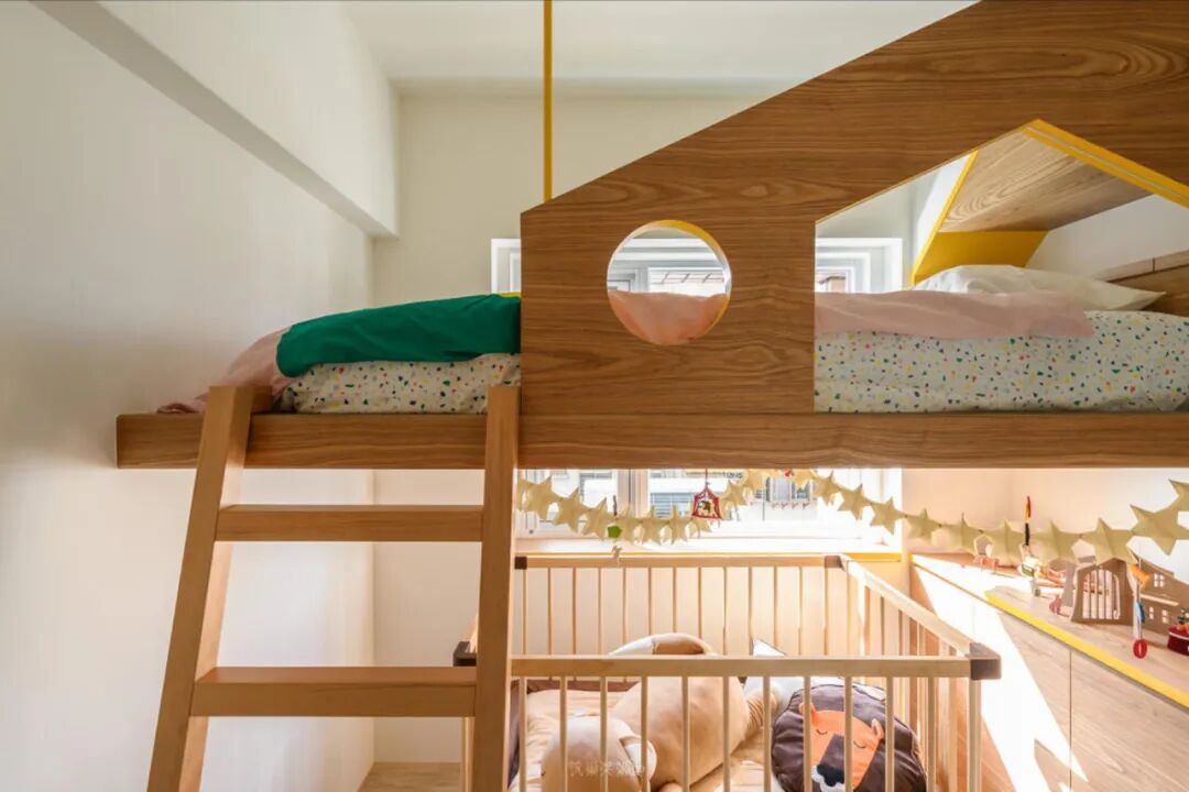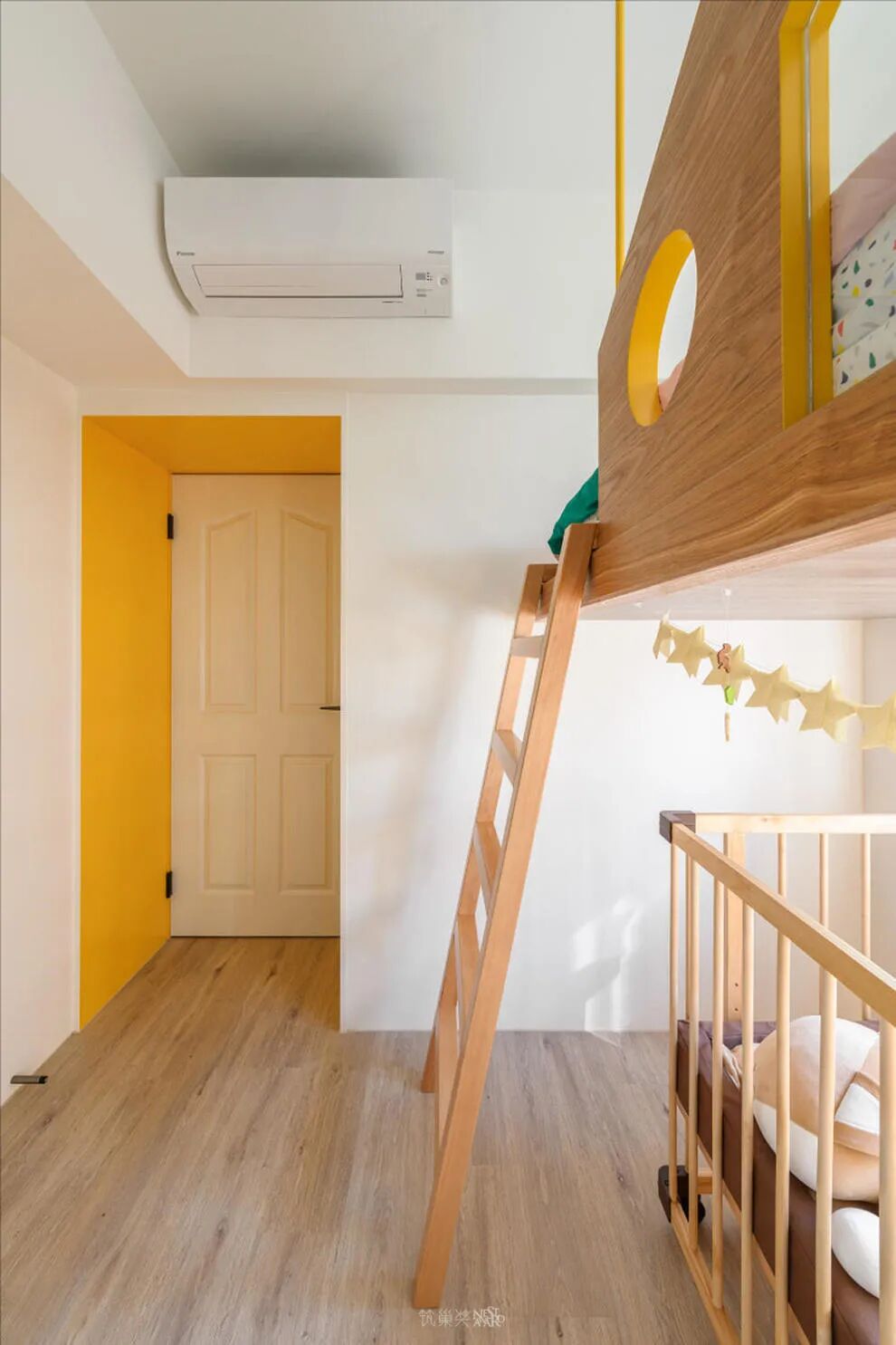 儿童房因为挑高的缘故,干脆就做成了一个木支架床,留下空间放婴儿床,方便照顾孩子,简单用心的设计,解决了不够“住”的问题,关键设计得很简单、舒适。