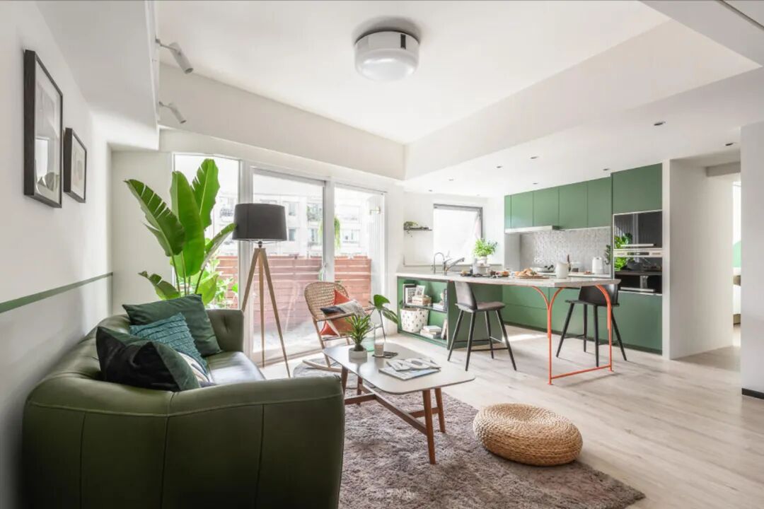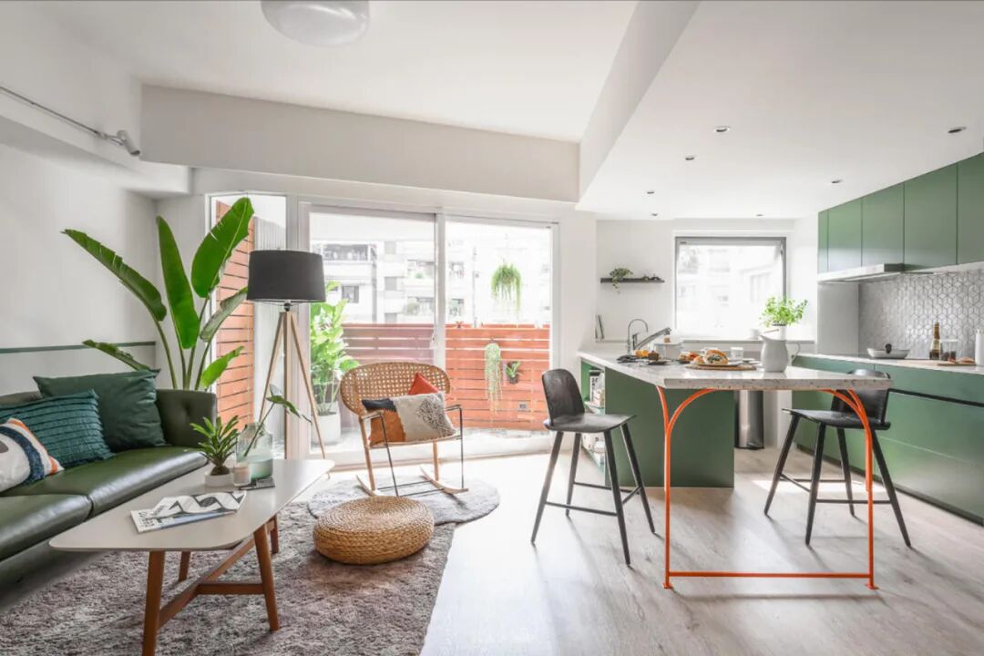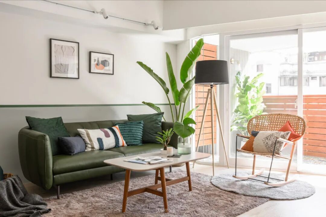 阳台出的玻璃门为空间“借光”,一下子全屋的采光得到了改善,作为整体的主色调,呈现饱和度和简洁感,穿插亮橘色铁件、水磨石、花砖等元素,增添活泼童趣感,并以植栽、浅色原木和藤编,表达对大自然的热爱。