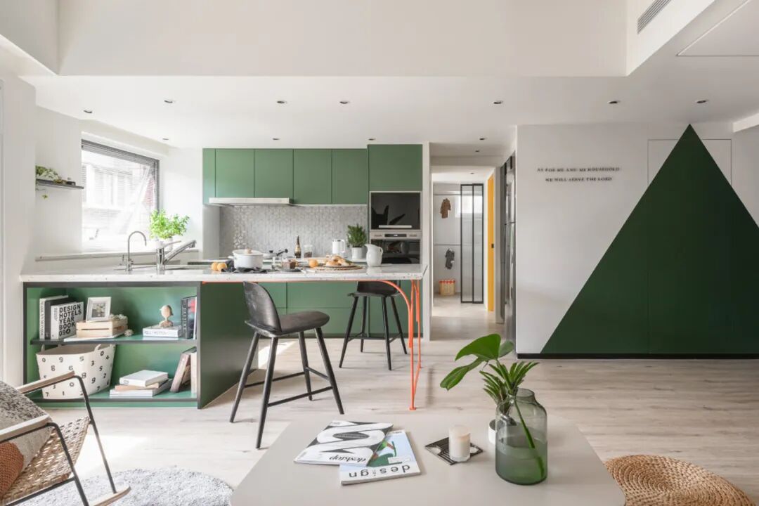 客厅、走廊背景墙以横向的线条和色彩延伸空间感,隐藏式的门片设计也使空间画面更加清爽,并将实用机能结合几何造型美学。