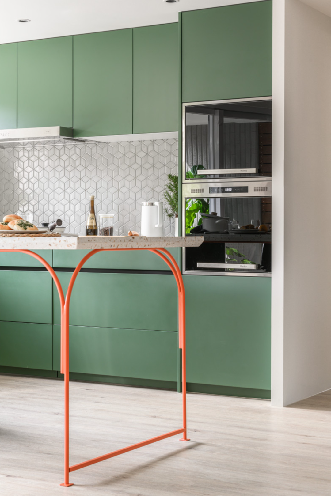 厨房从厨柜到吧台兼顾了收纳和使用的双重功能,满足日常生活之用,透过台面切割收边、桌脚造型等细节的铺陈呈现时尚、利落的设计质感。