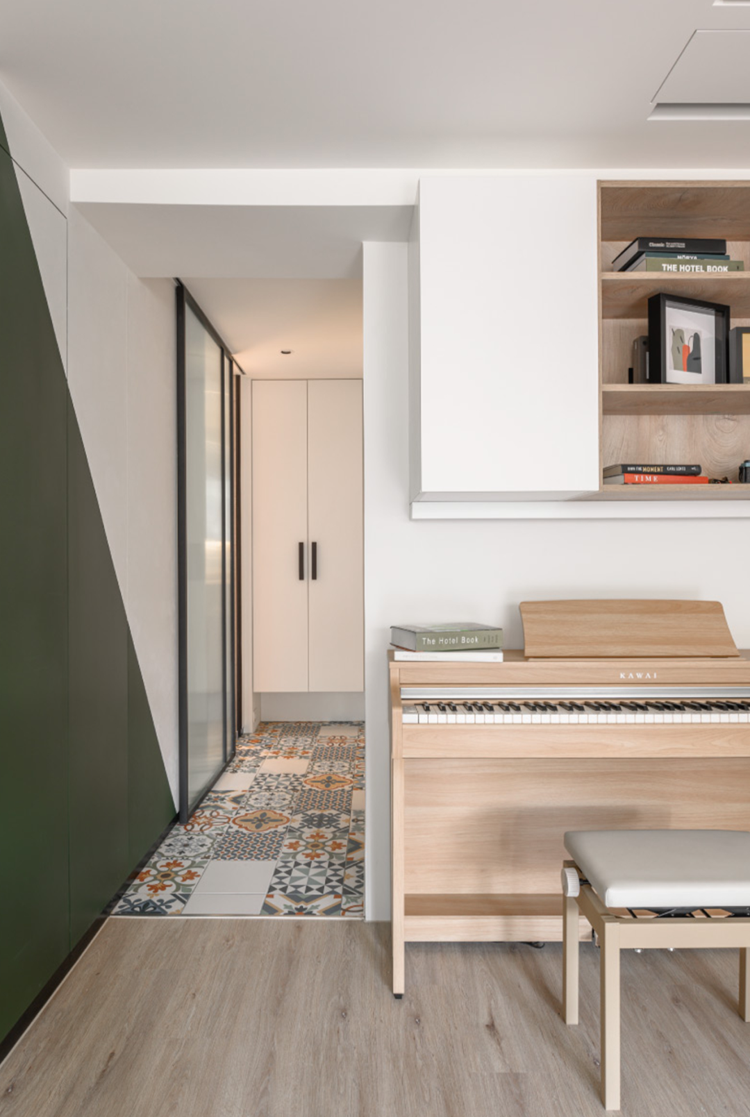 路过琴房往里走就是卫生间,特地铺贴了花砖来与整个空间的清新做呼应,避免湿气外流,让小空间处处能徜徉着自然的味道,打开后的空间瞬间变得开阔起来,家中也可进行10人以上亲友,以及与不同家庭的交流聚会。