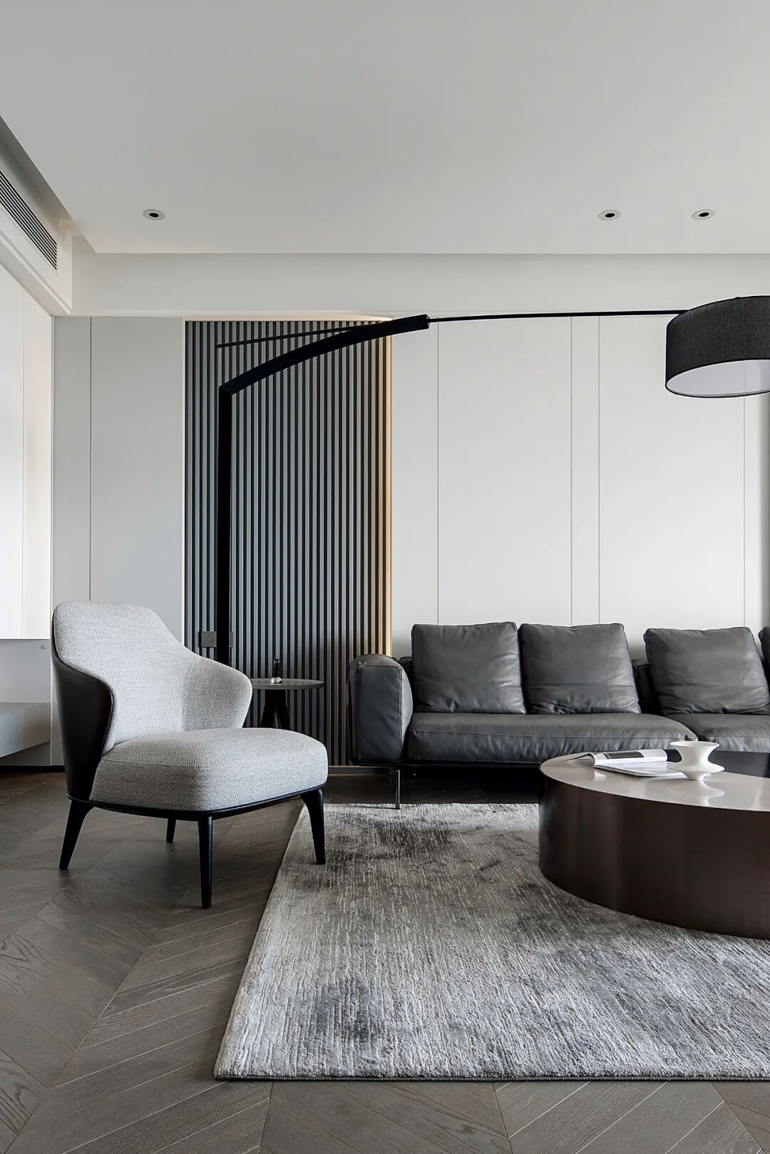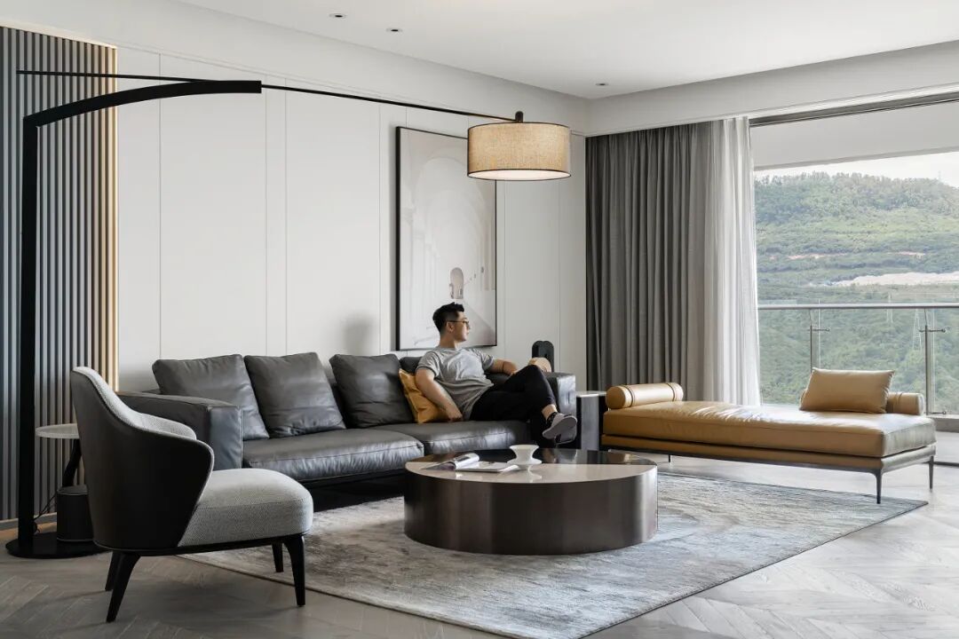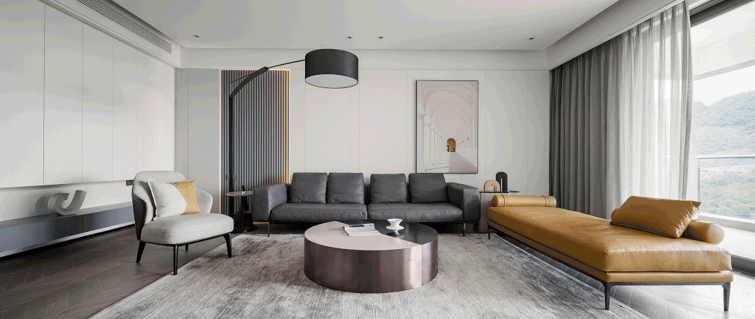 客厅以暖灰色为基调彰显精致优雅的空间氛围,时尚现代款家具和暗纹地毯的组合让人视觉焦点顺势下移,而线条感强烈、造型独特的钓鱼灯则又将视觉焦点拉高,上下之间,各有亮点。