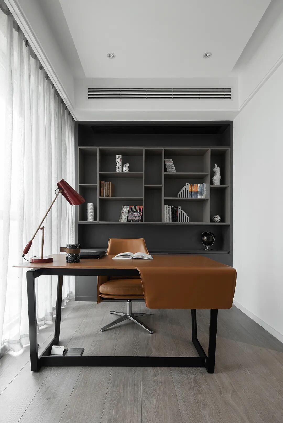 书房以黑色、白色和木色为基调,搭配亮眼的咖色软装,以简洁大气、有设计感的造型让空间充满艺术氛围。