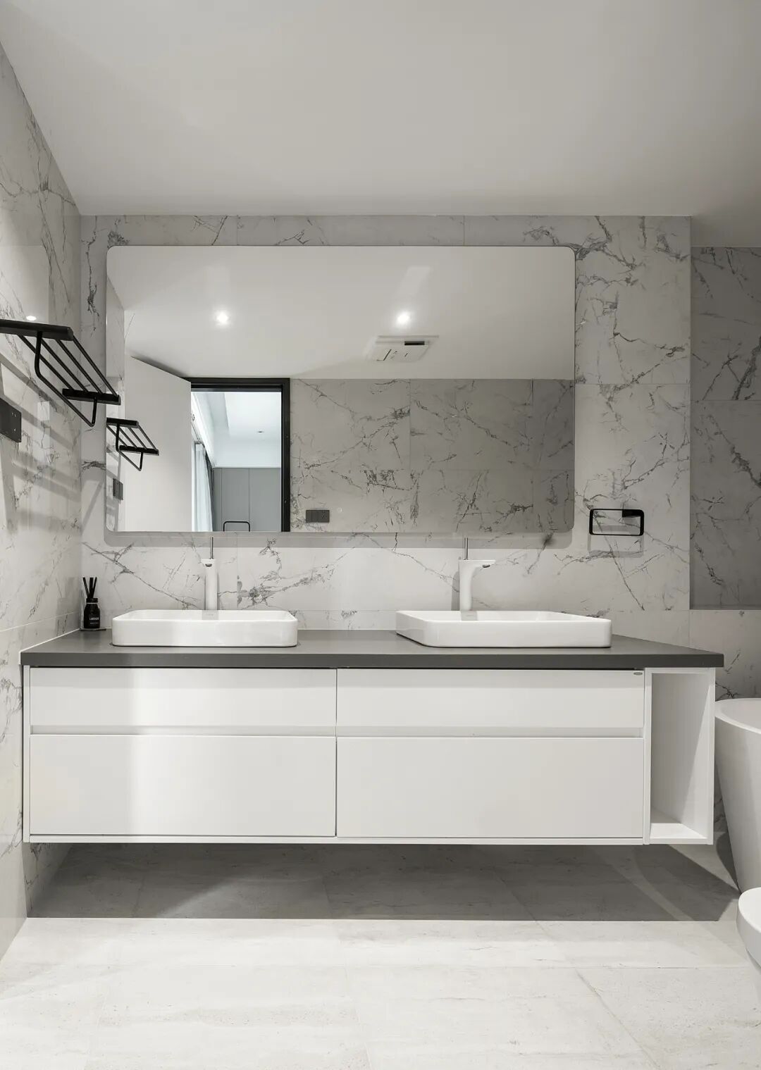 主卫以大理石材质为主,更显高端大气。双台盆和大镜面的设计让空间更加明亮通透,彰显一种美好、精致的生活态度。