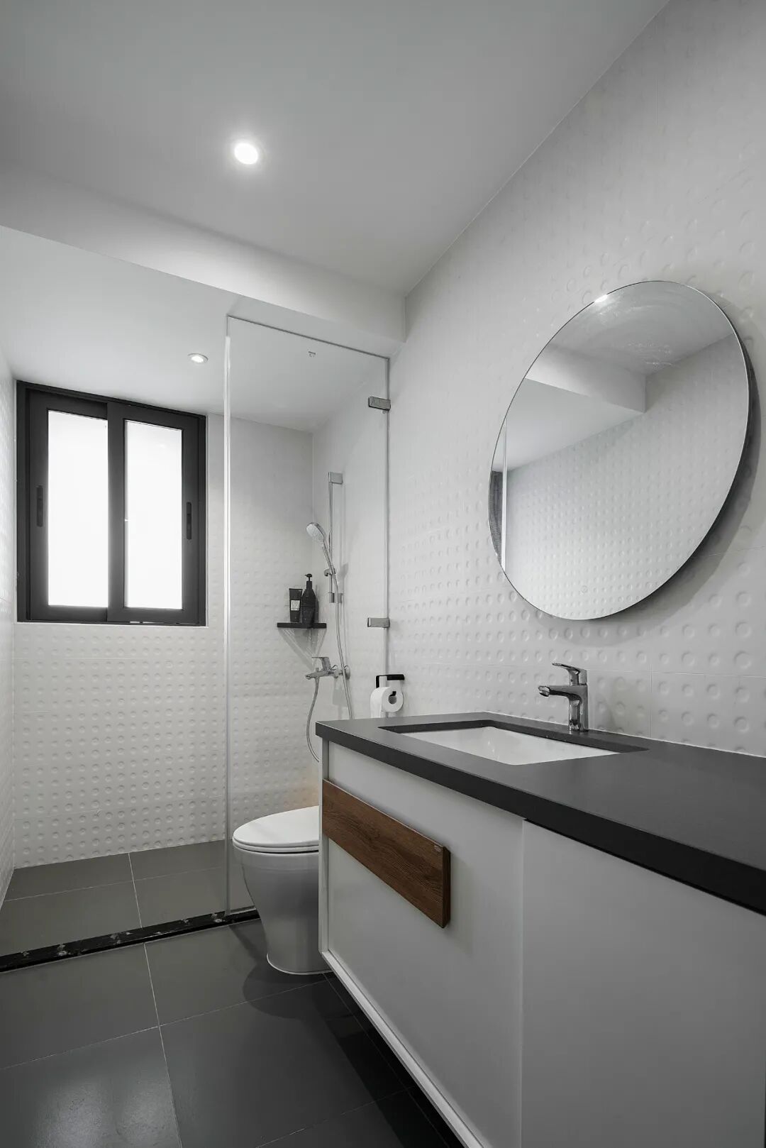 公卫规划合理、布局明确,淋浴区用玻璃门作为隔断,墙面使用现代、有序的瓷砖材质,凸显显时尚和未来感。