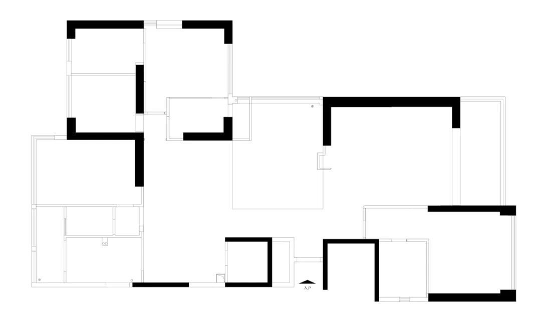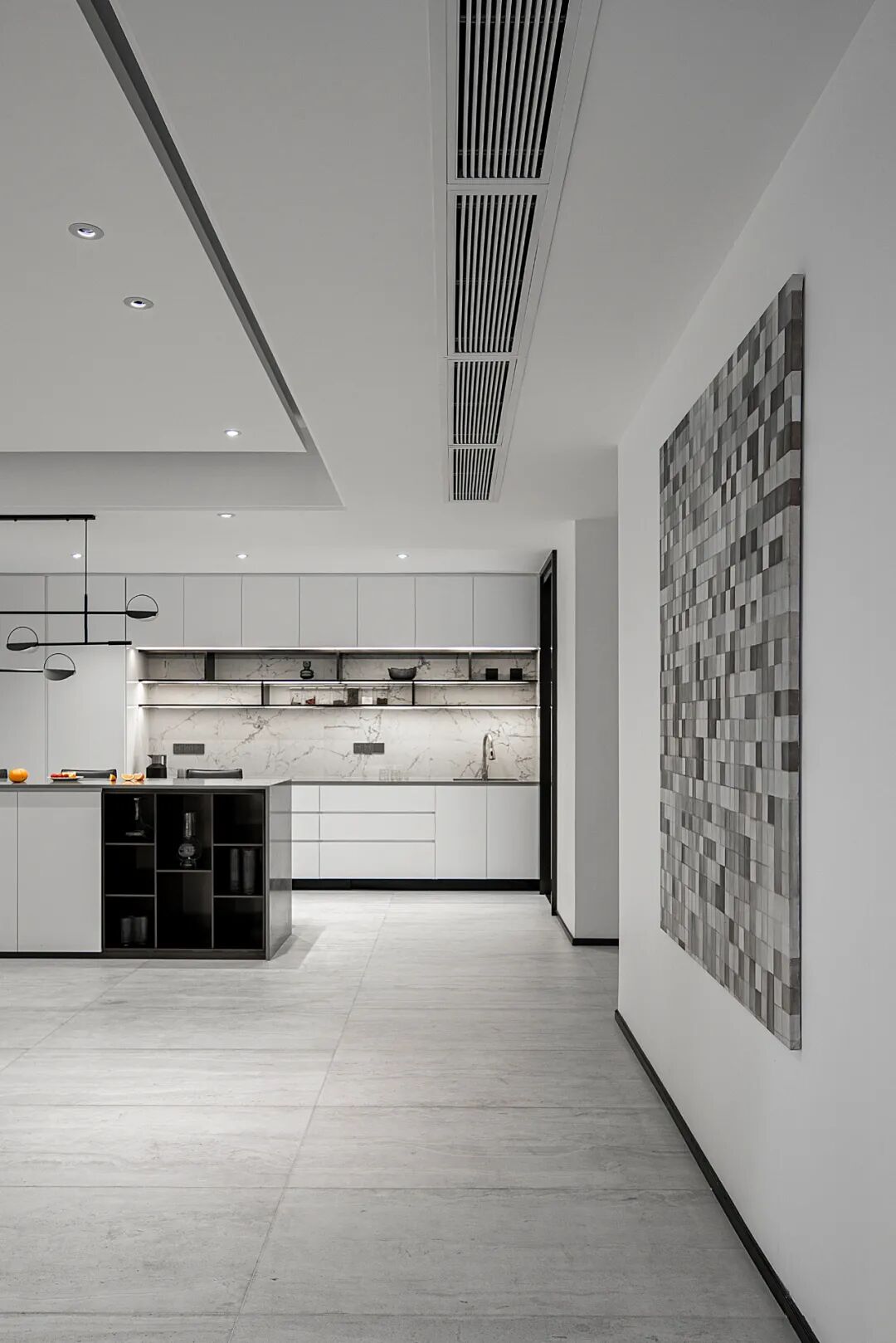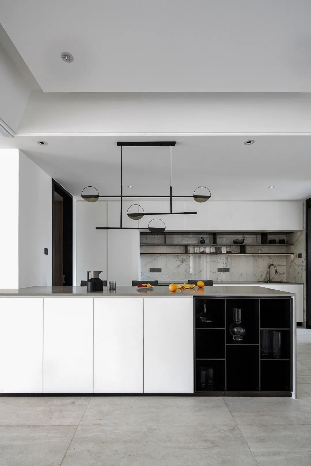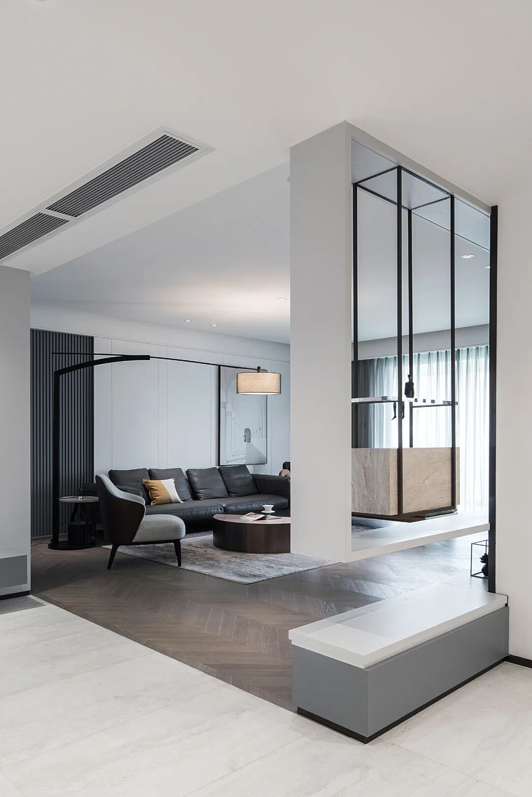 黑色钢条与大理石、烤漆板和瓷砖之间的体块穿插和组合让空间更有趣味,同时也便于业主及时看到入户情况,而从外往里看则会觉得内有乾坤,空间更有延伸感。