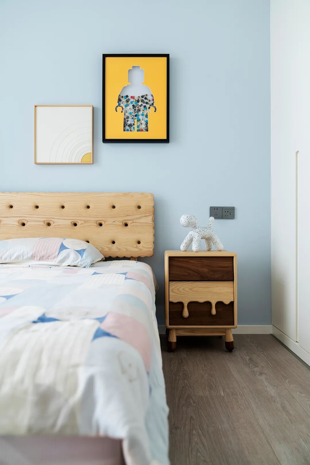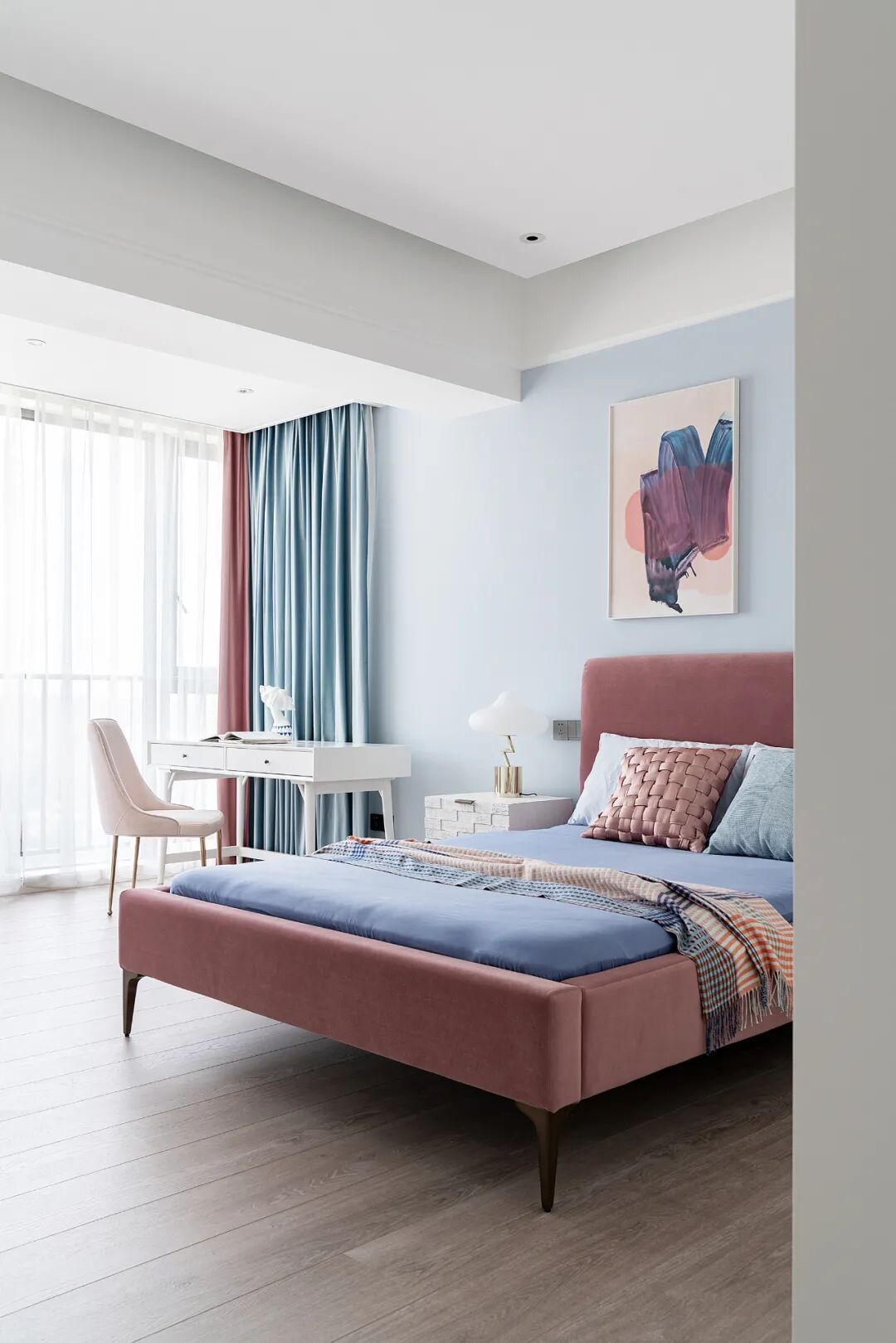 女孩房在设计上延续了整体简约的基调,蓝色艺术漆+粉色软装的组合有一种治愈的力量,为空间增添一份柔情与细腻。