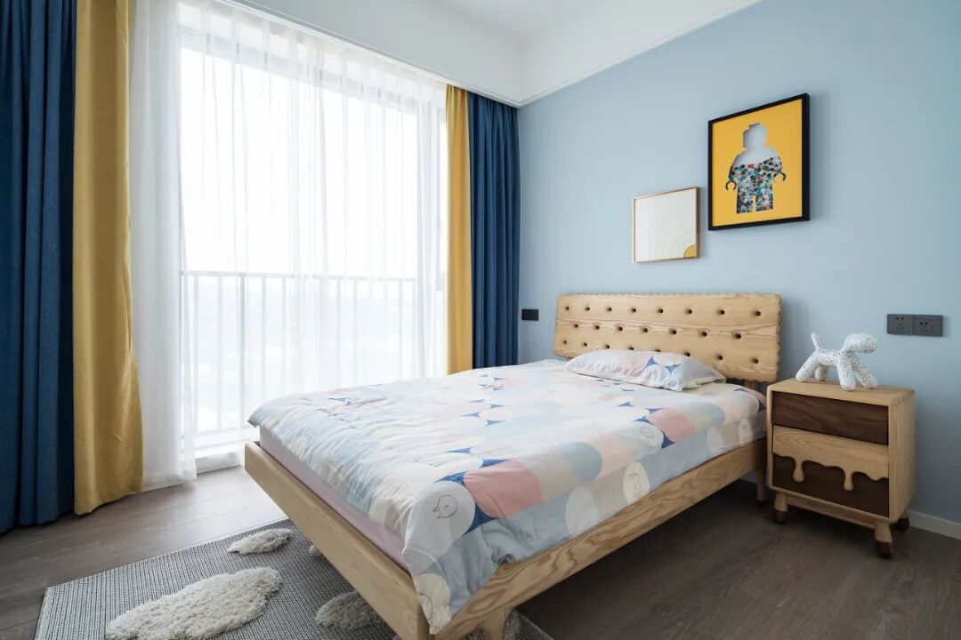 男孩房蓝色艺术漆+黄色软装的搭配让整个空间洋溢着青春活泼的气息,饼干状儿童床更是让空间充满童趣。开阔的落地窗不仅引入了充沛的阳光,也让空间更显轻松舒适。