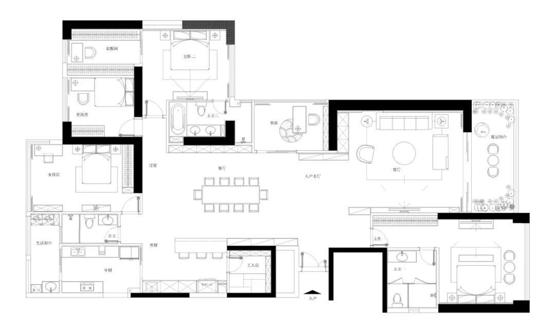 本案位于深圳,幸福的四口之家,还有一对可爱的儿女。拥有丰富阅历和独到审美的业主提出期望:“开放、艺术化,突出大平层的空间感。除了卧室外,都不要太生活化。”