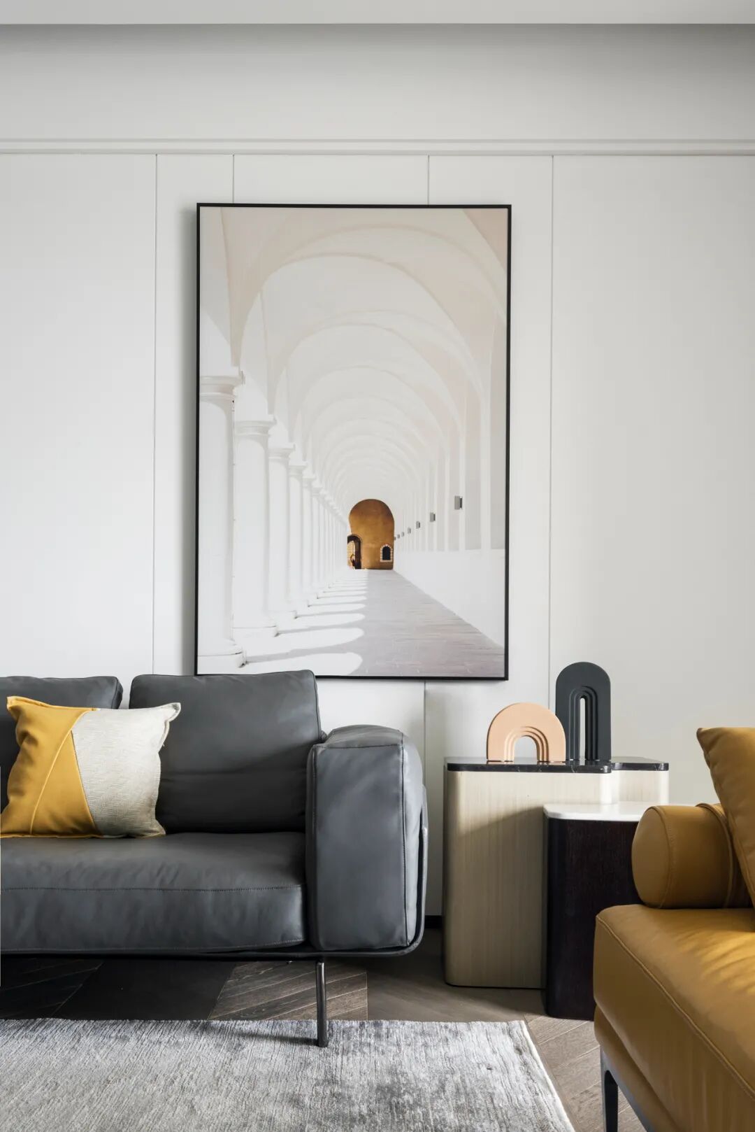 客厅围合布局式家具突破了造型的限制,让空间更为灵活宽敞。沙发后带拱门元素的挂画与边几上弧形摆件相呼应,构建了抽象与现实的气质联结,为空间增添许多生活意趣。