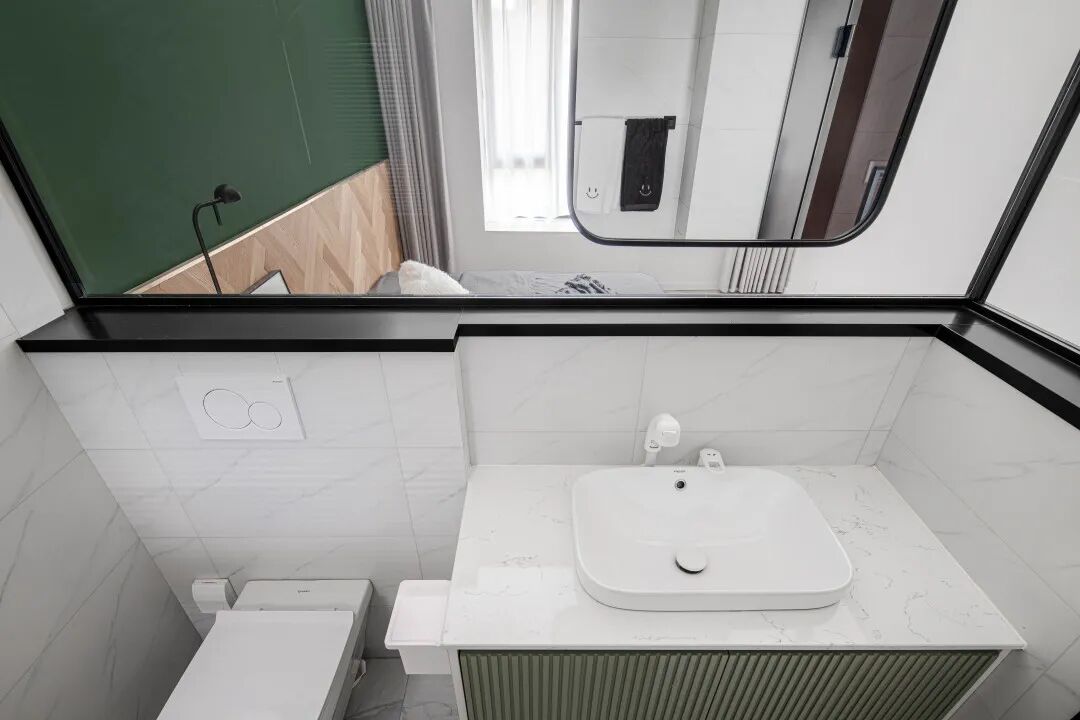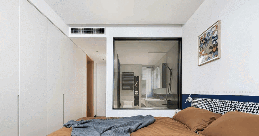 玻璃墙或半墙+玻璃:主卧暗卫本身的隐私性是足够的,只需解决采光差和隔绝湿气的问题。不如用玻璃代替整面墙,或是半墙+玻璃共享主卧采光,吊镜代替嵌入式浴镜增加通透感。