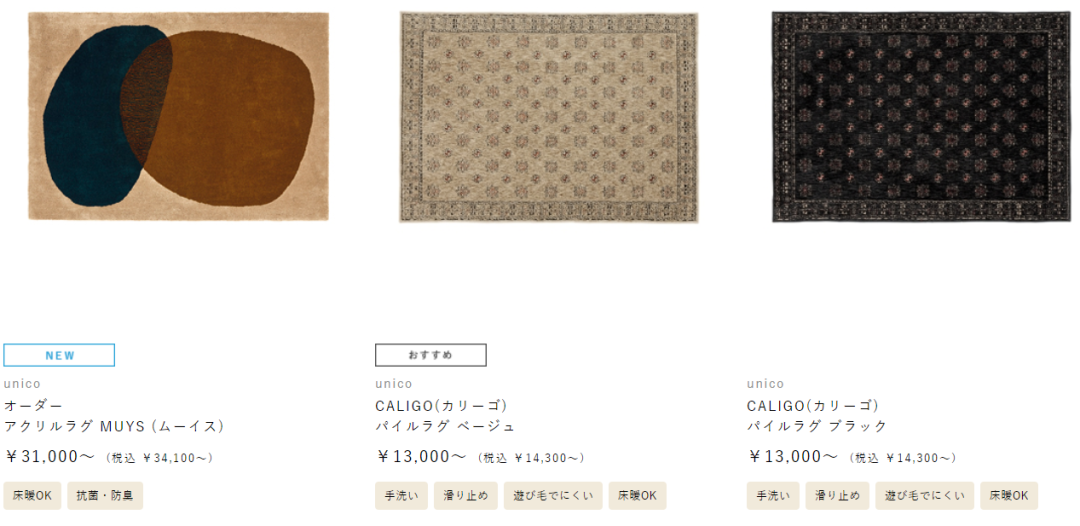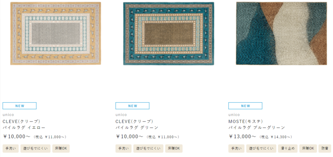 以地毯为例,Unico的官网详细地介绍了不同地毯的不同功能、性能、编织方法、素材特性、尺寸搭配、保养方式等等。