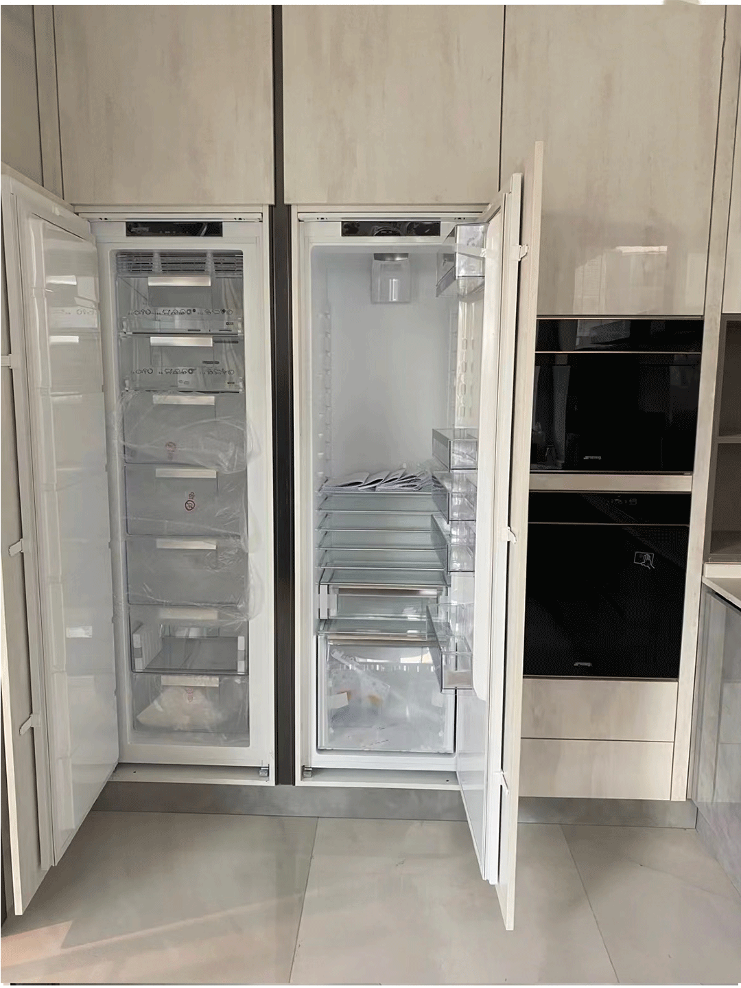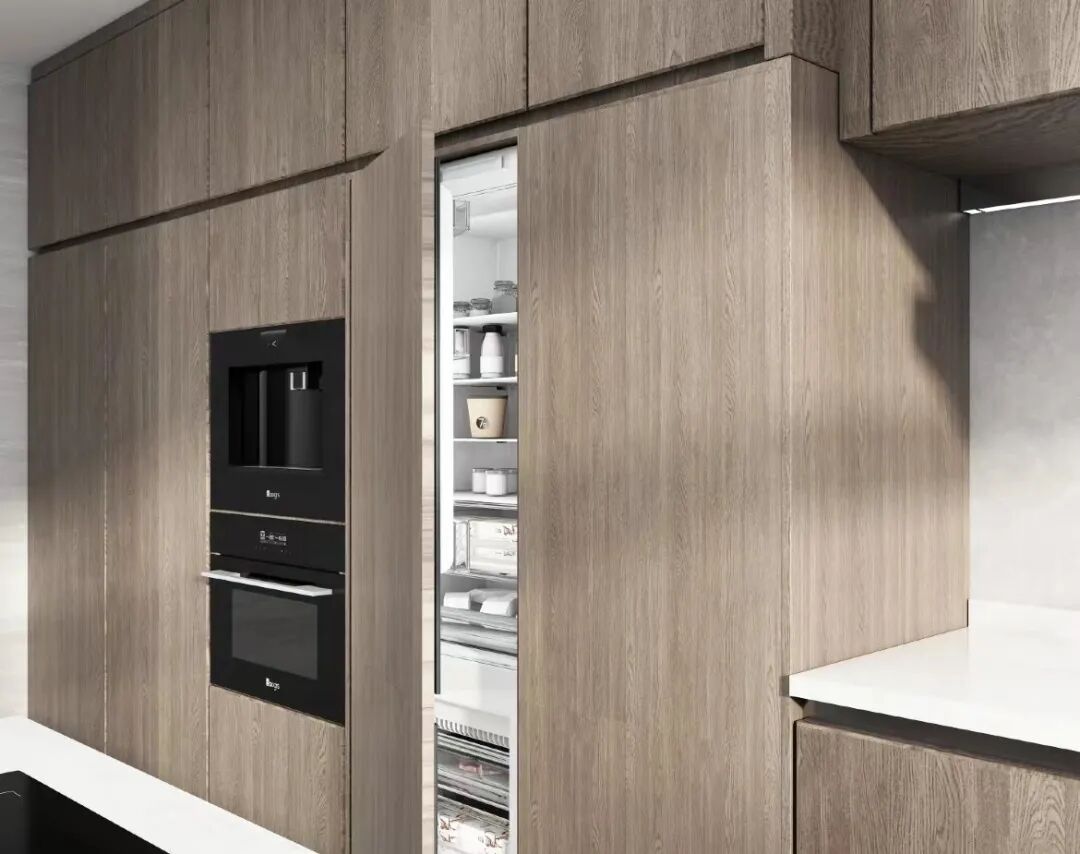 嵌入式冰箱与独立的传统冰箱不同,真正的嵌入式冰箱是完美的和柜体融合,合二为一,不会额外的突出。