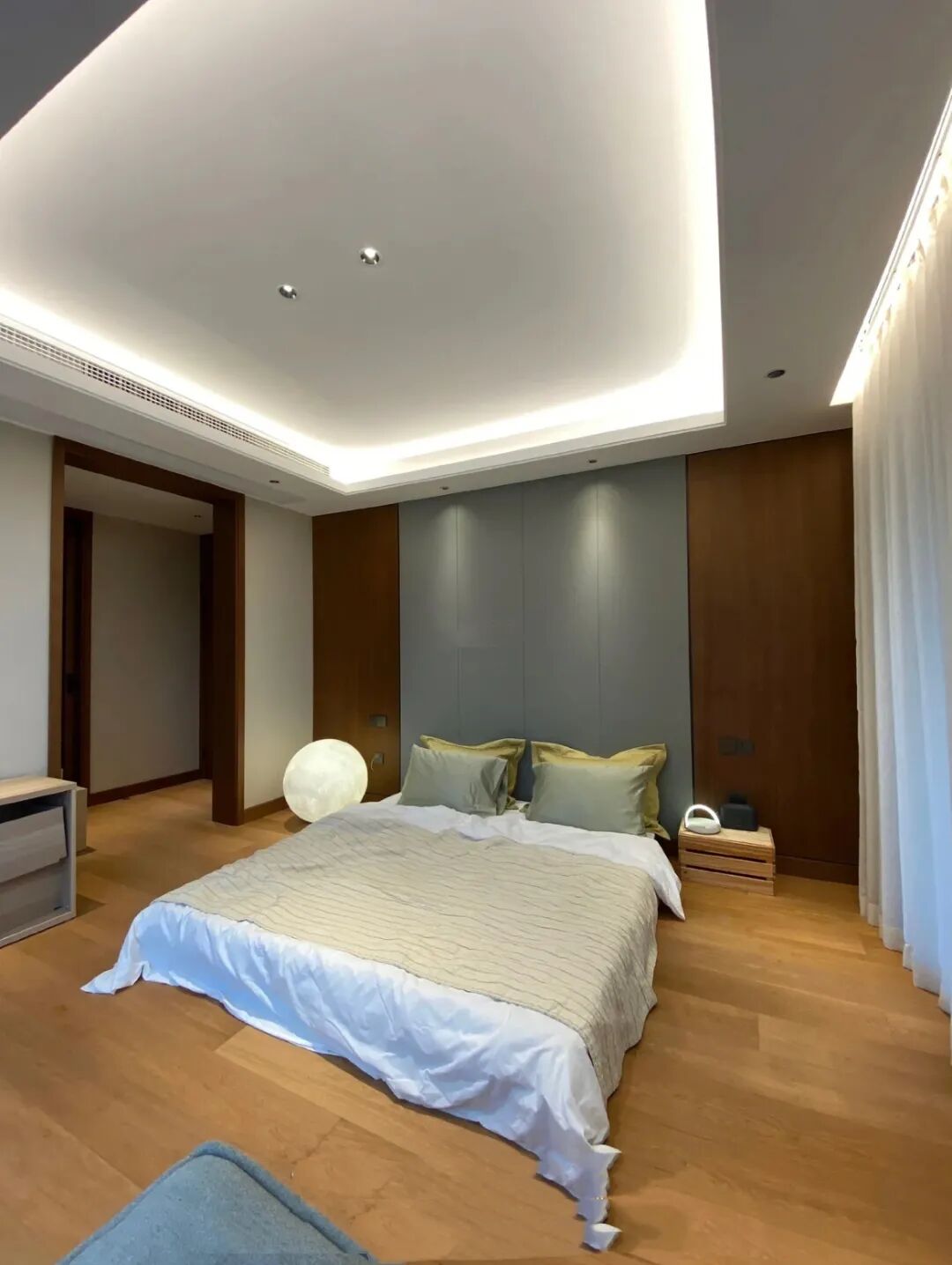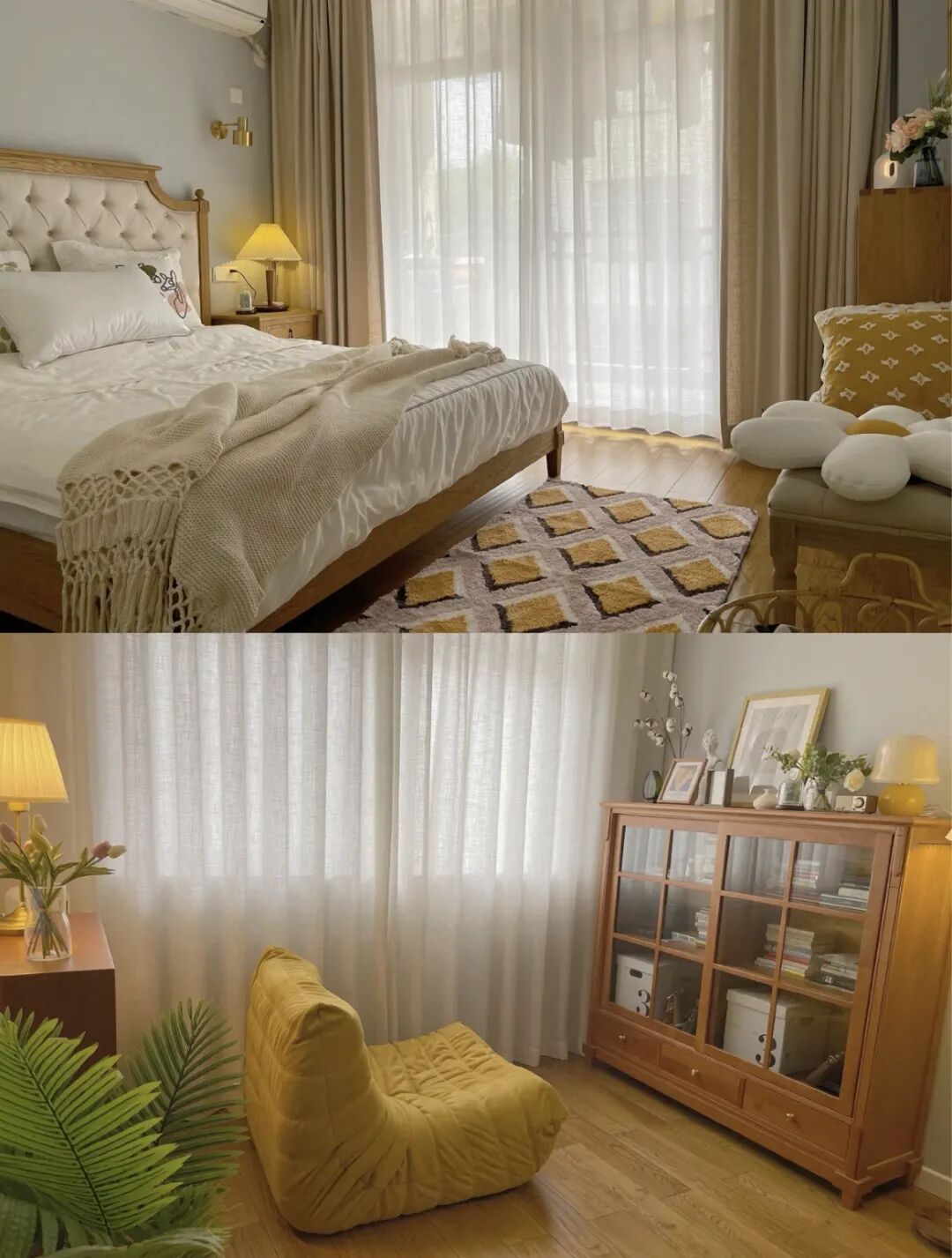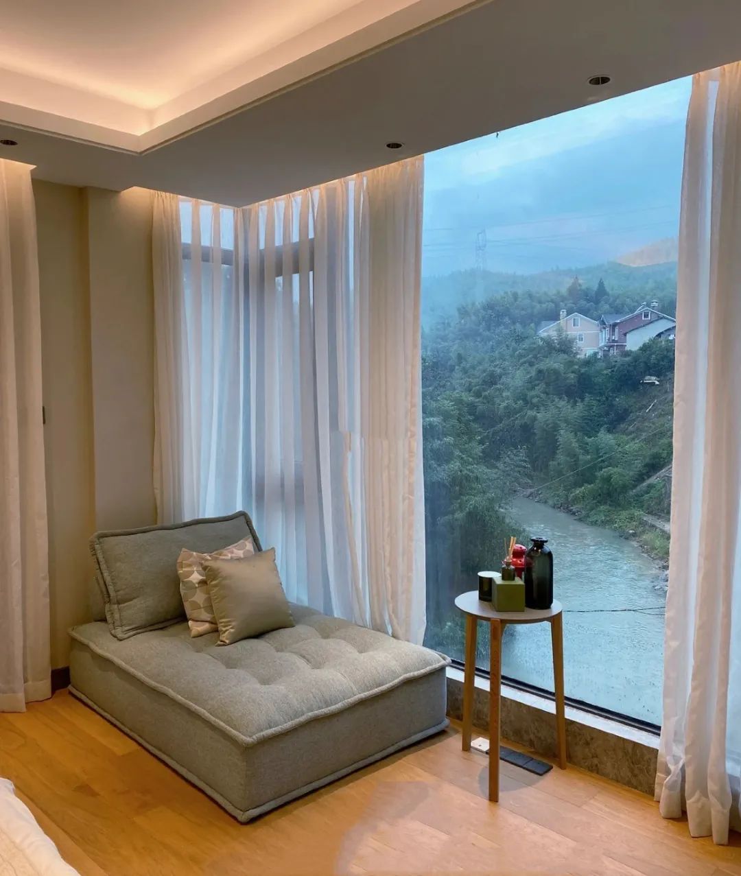 卧室采用了无主灯设计,避免出现刺眼的强光。巨大的落地窗旁边一个单人沙发配上茶几,拉开窗帘就可以一眼看到乡间流水的景色,喝喝茶、看看景很是自在。