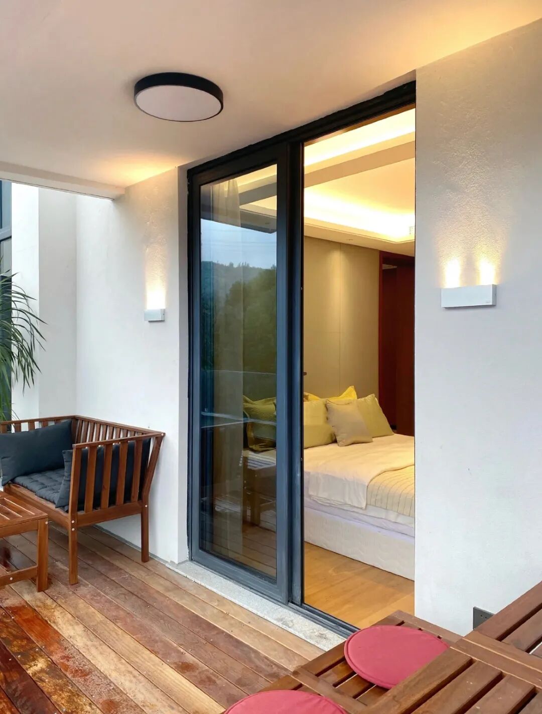 而另一个卧室则设计了一个开放式的阳台,采光效果更好。同时阳台上也放置了座椅茶几,向下望去视野极好。
